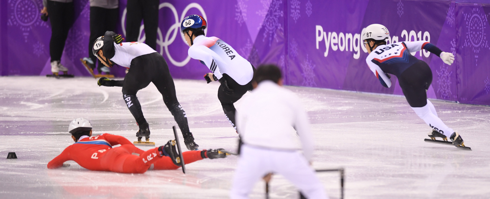 북한 정광범이 20일 오후 강원도 강릉 아이스아레나에서 열린 2018 평창동계올림픽 쇼트트랙 남자 500m 예선전에 출전해 경기중 넘어지고 있다. 2018. 02. 20 사진/ 2018 평창사진공동취재단