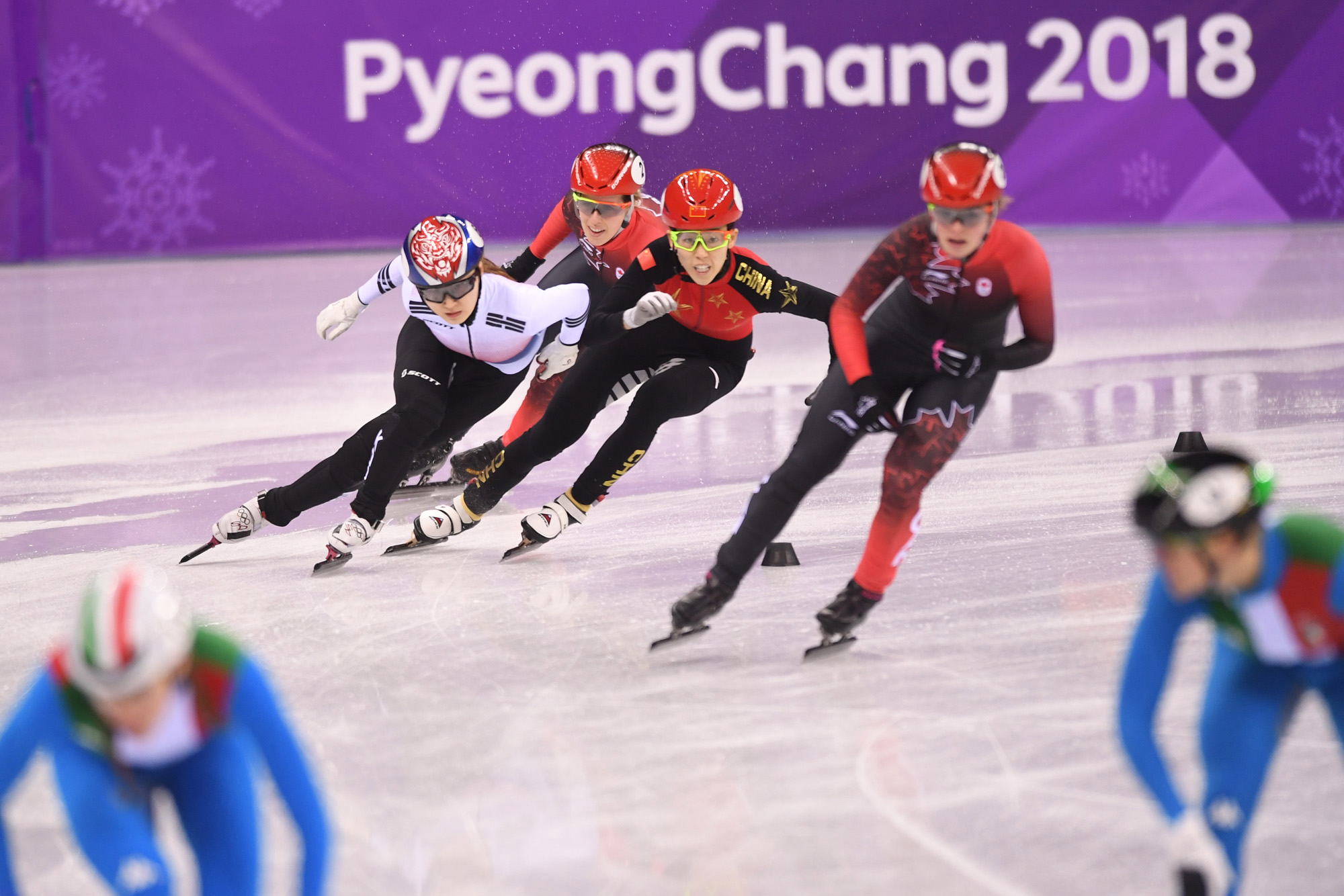 한국 최민정이 20일 오후 강원도 강릉 아이스아레나에서 열린 2018 평창동계올림픽 쇼트트랙 여자 3000m 계주 결선에 출전해 질주하고 있다. 2018. 02. 20 사진/ 2018 평창사진공동취재단
