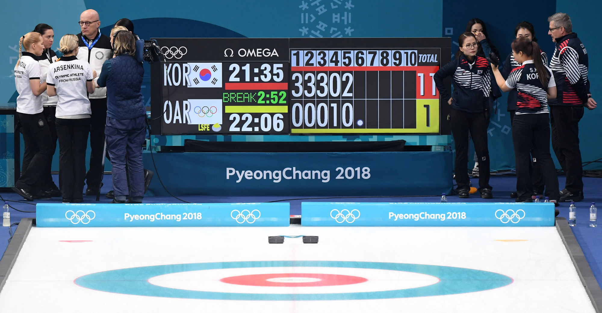 21일 오전 강원도 강릉 컬링센터에서 열린 2018 평창동계올림픽 여자 컬링 예선 한국과 러시아 출신 올림픽 선수들(OAR)의 경기에 6엔드를 앞두고 양팀 진영에서 작전을 구상하고 있다. 2018.02.21 2018평창사진공동취재단