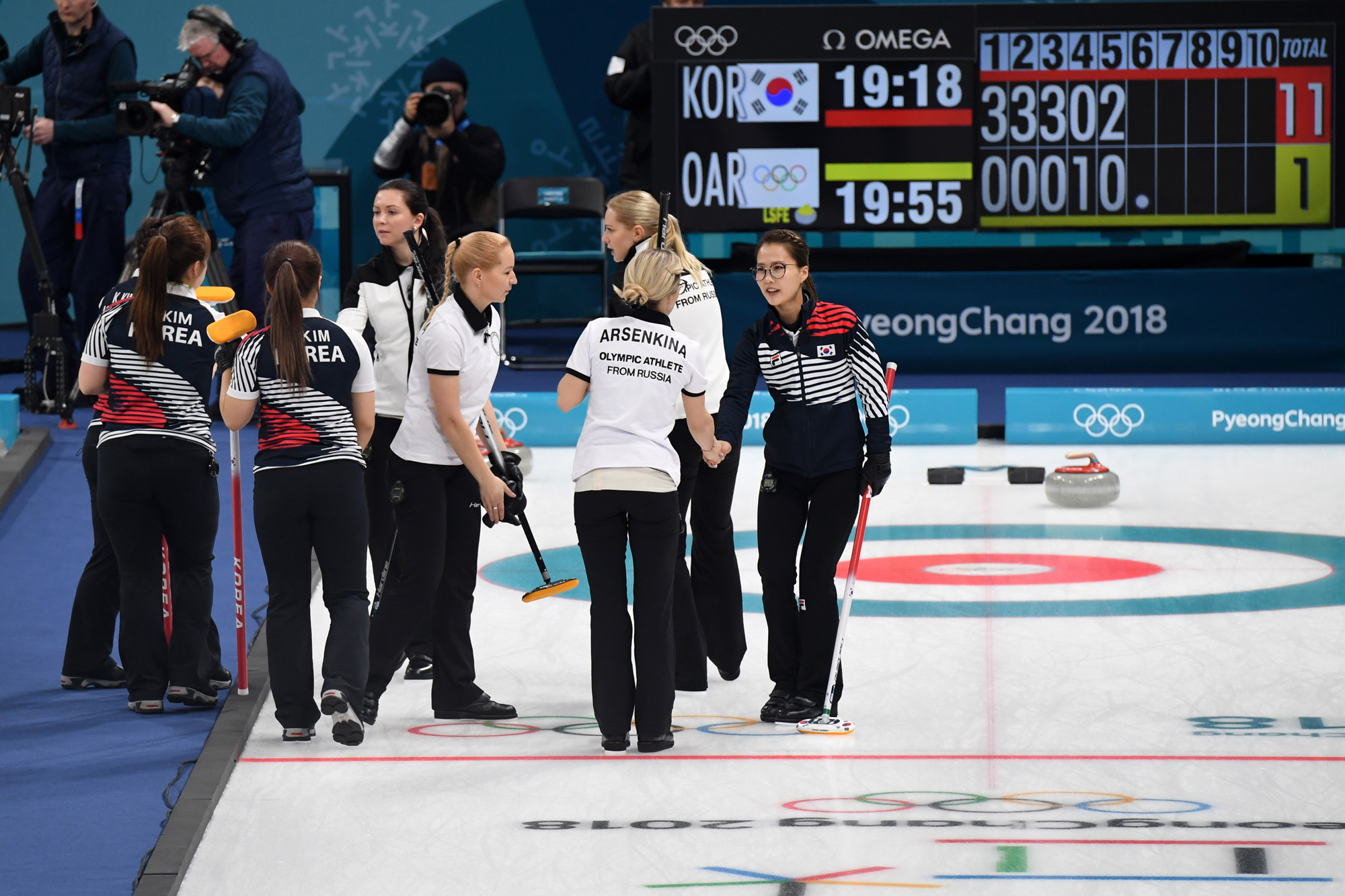 한국 여자 컬링 대표팀이 21일 오전 강원도 강릉 컬링센터에서 2018 평창동계올림픽 여자 컬링 예선 한국과 러시아 출신 올림픽 선수들(OAR)의 경기에서 6엔드 11-2로 기권승을 받아 낸 뒤 상대팀 선수들과 악수하고 있다. 2018.02.21 2018평창사진공동취재단