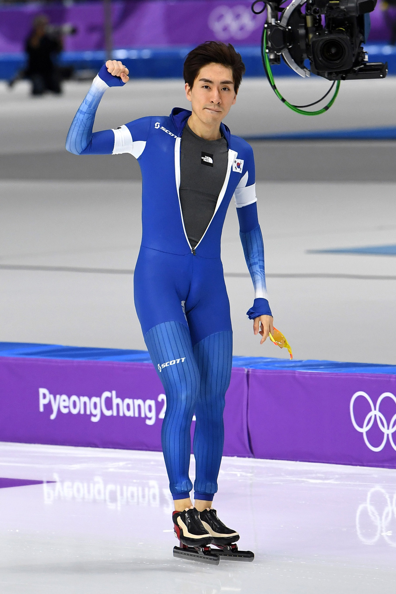 21일 오후 강원도 강릉 스피드스케이팅 경기장에서 열릴 2018 평창동계올림픽 스피드스케이팅 남자 팀추월 준결선에 출전한 한국 대표팀 이승훈이 질주를 마치고 기록을 본 뒤 주먹을 불끈 쥐고 있다. 2018. 02. 21 2018 평창사진공동취재단
