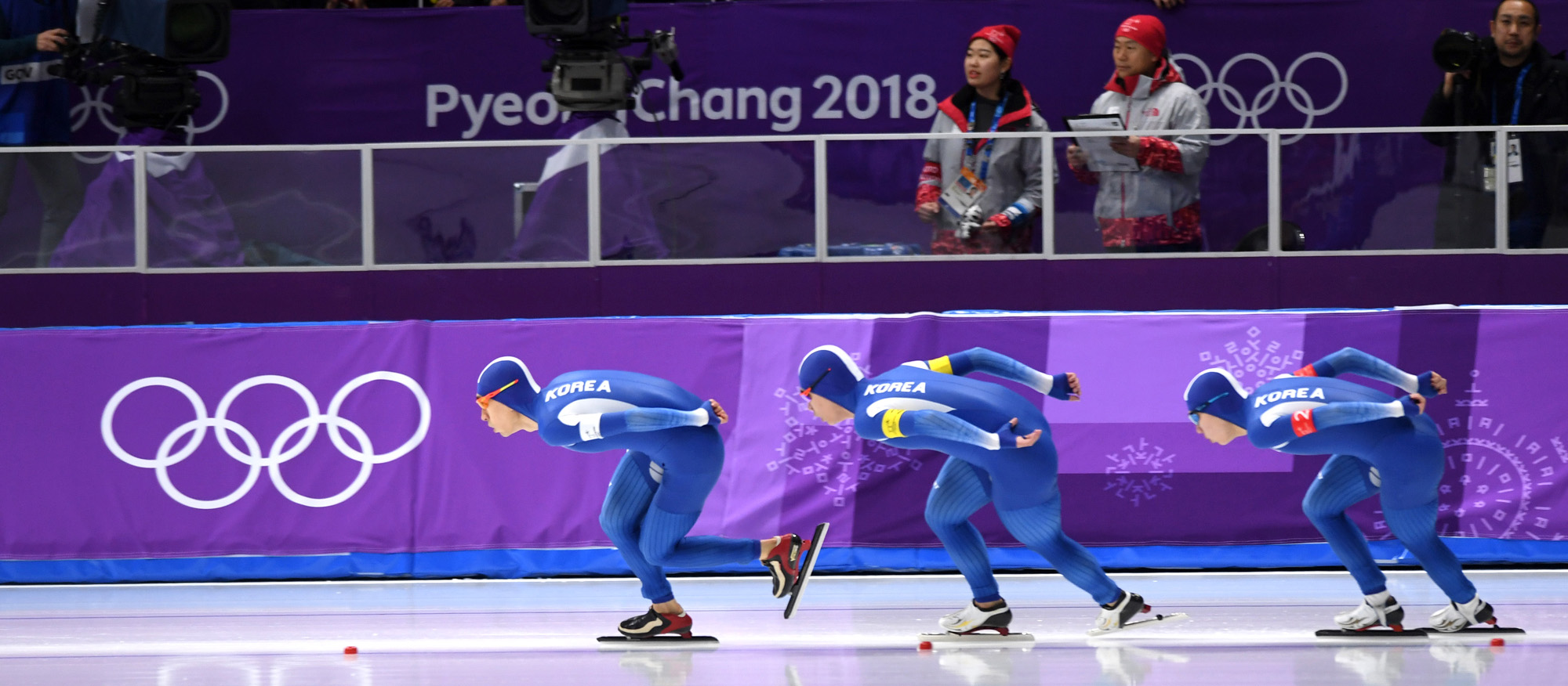 21일 오후 강원도 강릉 스피드스케이팅 경기장에서 열릴 2018 평창동계올림픽 스피드스케이팅 남자 팀추월 준결선에 출전한 한국 대표팀 이승훈, 김민석, 정재원이 빙상 위 질주를 펼치고 있다. 2018. 02. 21 2018 평창사진공동취재단