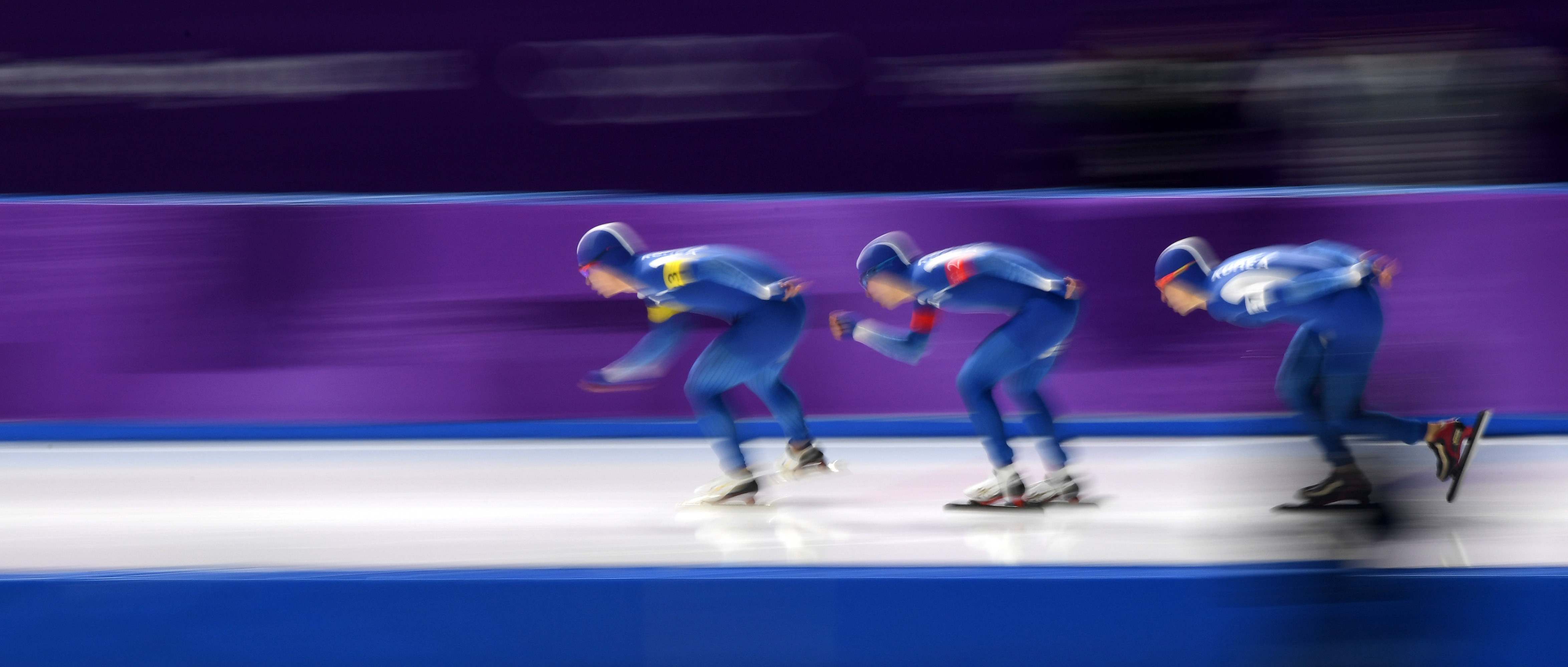 21일 오후 강원도 강릉 스피드스케이팅 경기장에서 열린 2018 평창동계올림픽 스피드스케이팅 남자 팀추월 결선에 출전한 한국 이승훈, 김민석, 정재원이 질주 하고 있다. 2018. 02. 21 2018 평창사진공동취재단