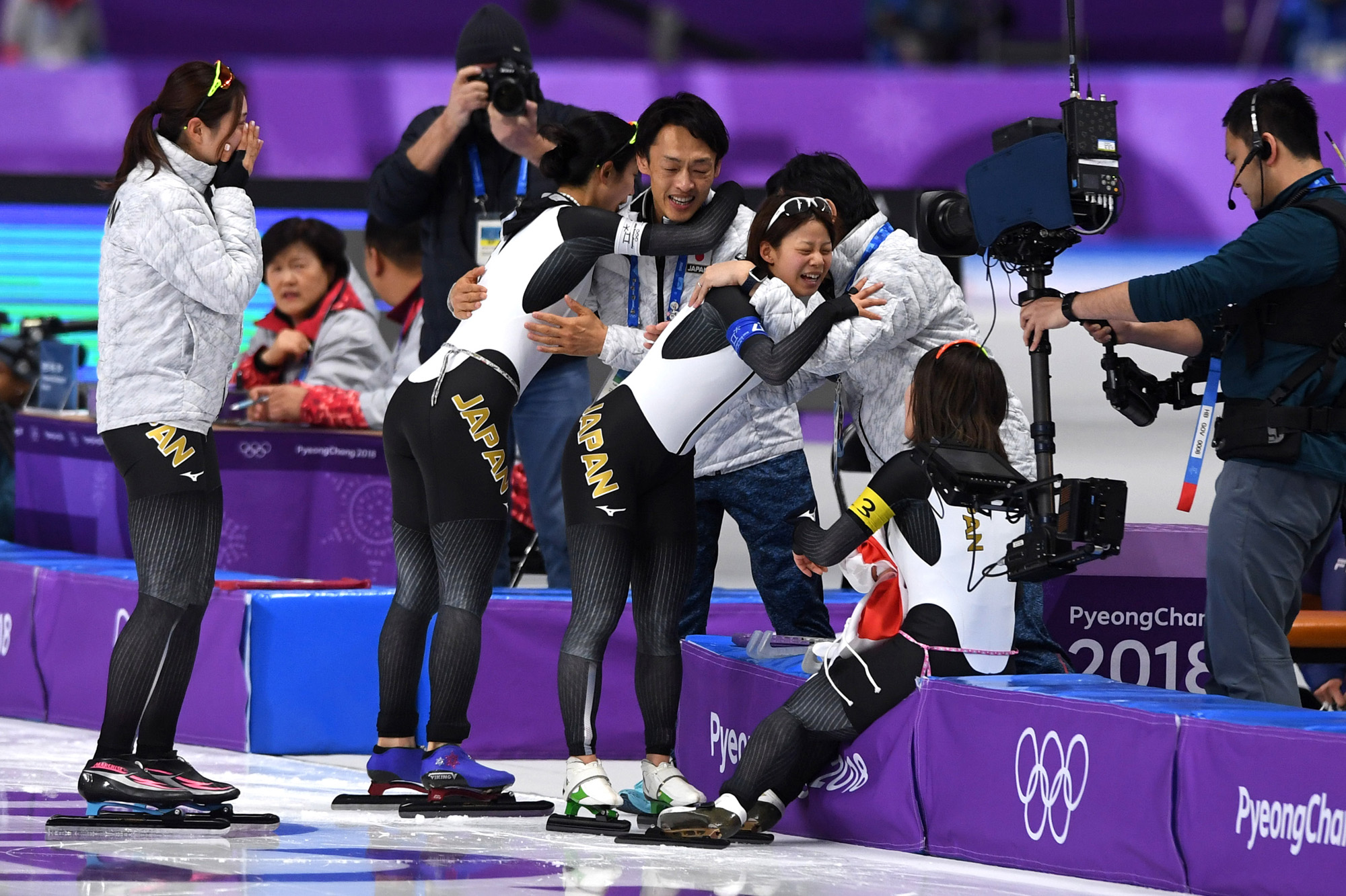 21일 오후 강원도 강릉 스피드스케이팅 경기장에서 열린 2018 평창동계올림픽 스피드스케이팅 여자 팀추월에 일본 대표팀이 1위를 차지, 금메달을 확정짓고 코치와 포옹하고 있다. 2018. 02. 21 2018 평창사진공동취재단