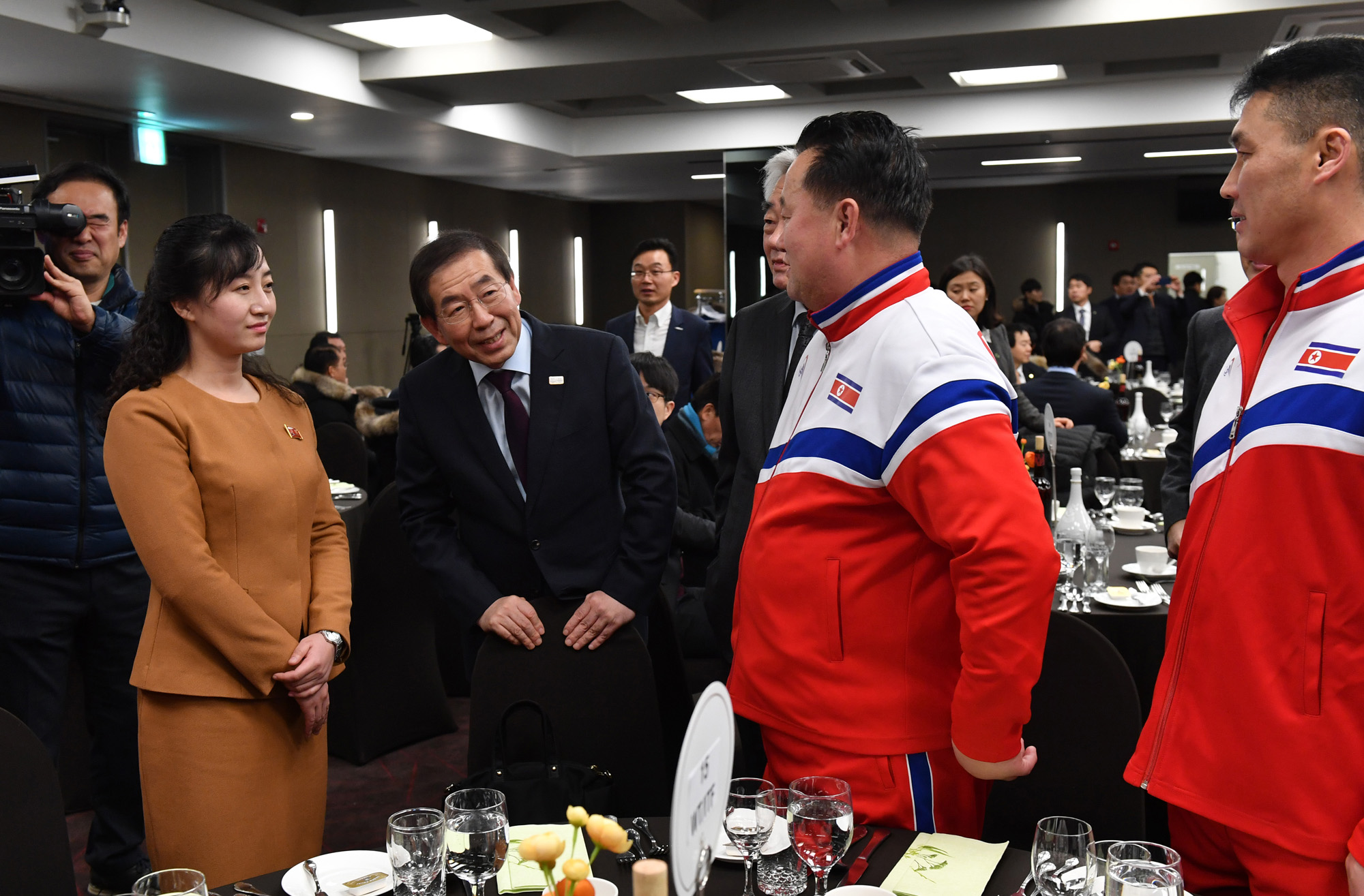 박원순 서울시장이 12일 오후 서울 종로구 세종문화회관 세종홀에서 열린 남북 태권도 시범단 환영만찬에서 남북한 선수들을 격려하고 있다. 서울시 제공
