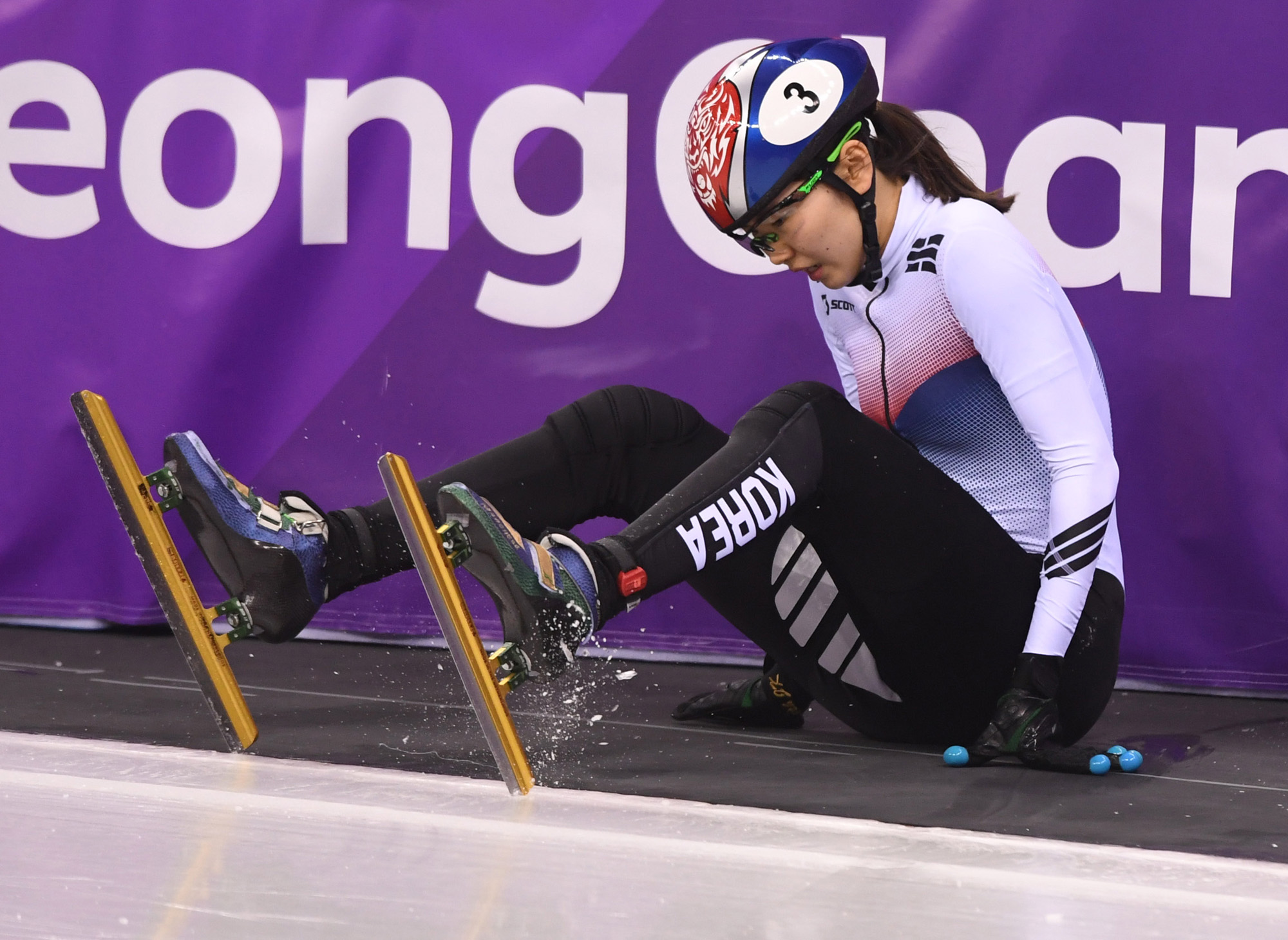 한국 심석희가 22일 오후 강원도 강릉 아이스아레나에서 열린 2018 평창동계올림픽 쇼트트랙 스피드스케이팅 여자 1000m 결승에 출전해 경기중 넘어지고 있다. 2018. 02. 22 2018 평창사진공동취재단
