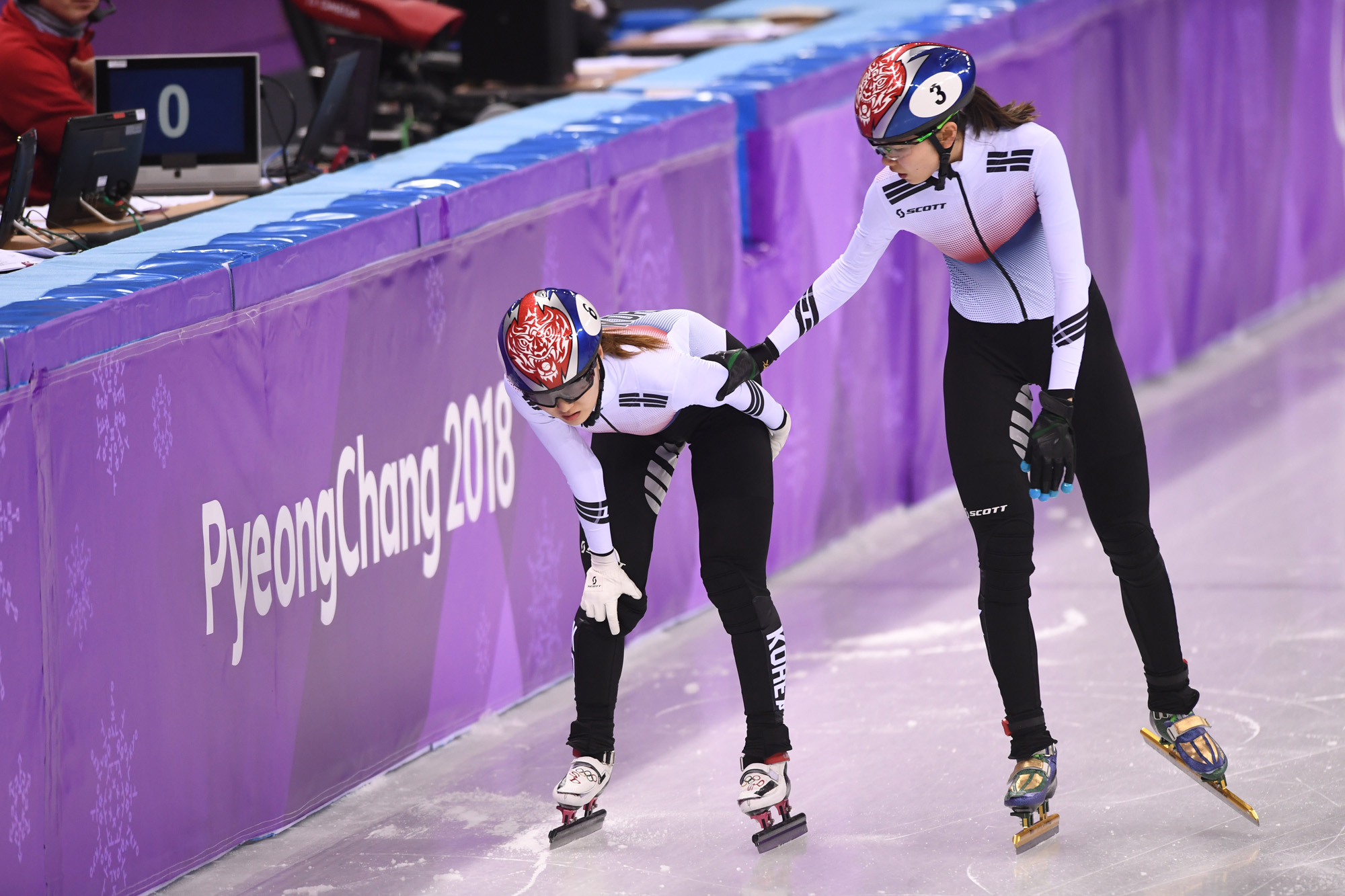 한국 심석희와 최민정이 22일 오후 강원도 강릉 아이스아레나에서 열린 2018 평창동계올림픽 쇼트트랙 스피드스케이팅 여자 1000m 결승에 출전해 레이스를 마치고 대화하고 있다.2018. 02. 22 2018 평창사진공동취재단