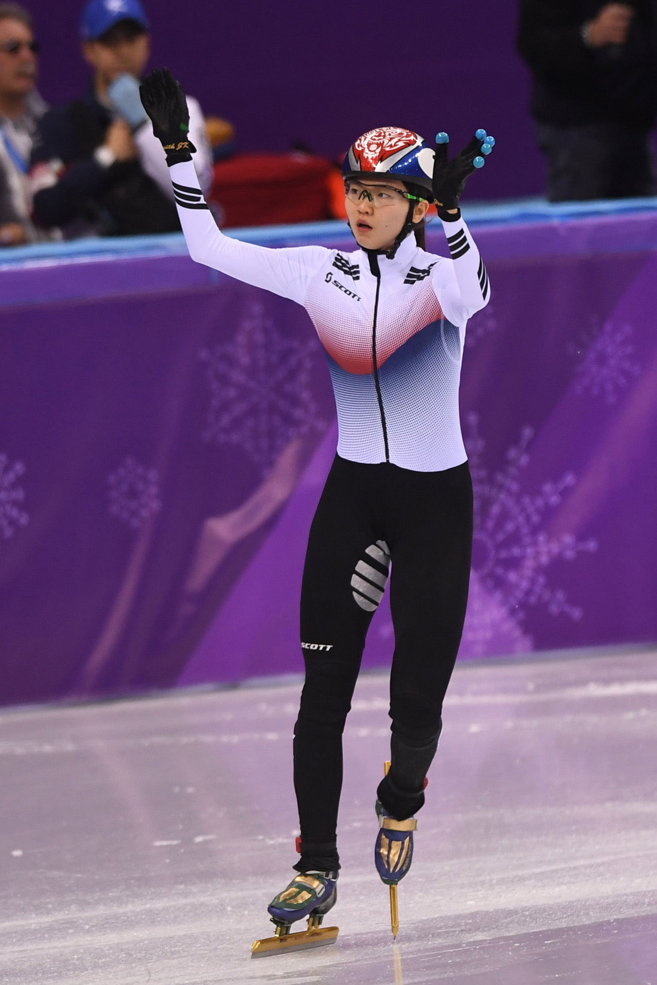 한국 심석희가 22일 오후 강원도 강릉 아이스아레나에서 열린 2018 평창동계올림픽 쇼트트랙 스피드스케이팅 여자 1000m 준준결승에 출전해 준결승 진출을 확정짓고 인사하고 있다.2018. 02. 22 2018 평창사진공동취재단