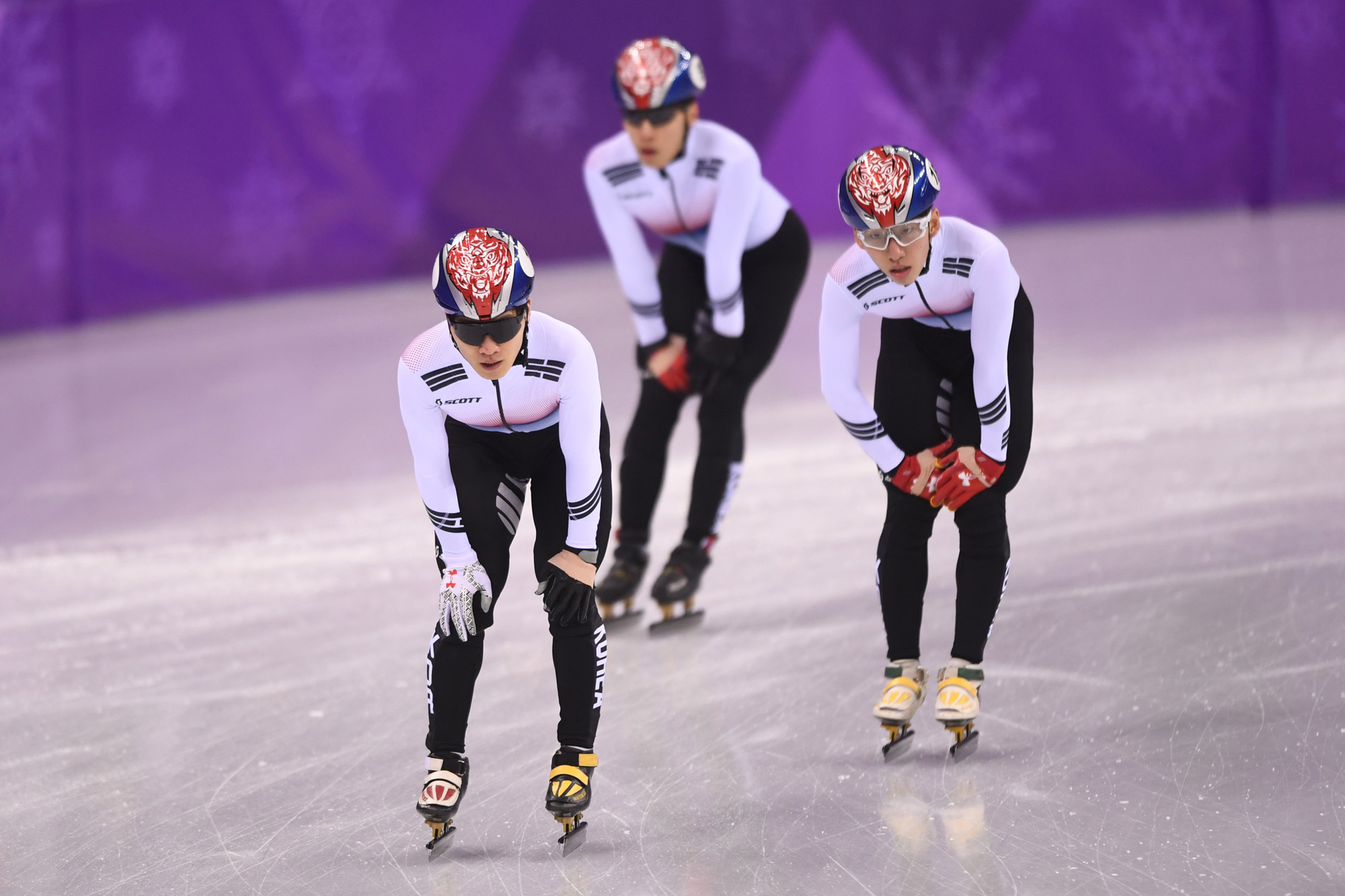 한국 서이라, 임효준, 황대헌이 22일 강원도 강릉 아이스아레나에서 열리는 2018 평창동계올림픽 쇼트트랙 스피드스케이팅 남자 5000m 결선을 앞두고 훈련을 하고 있다.2018. 02. 22 2018 평창사진공동취재단
