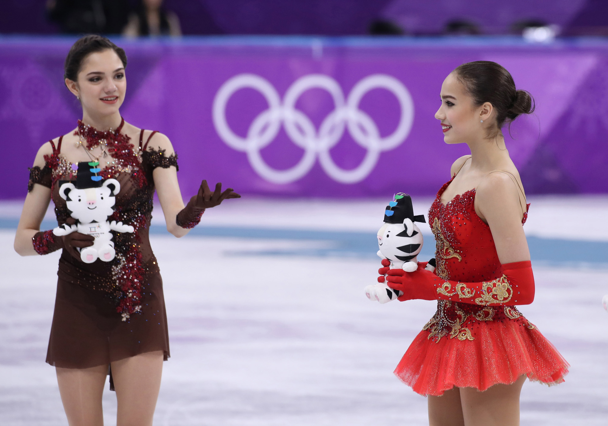 23일 강릉 아이스아레나에서 열린 피겨스케이팅 여자 싱글 프리스케이팅에서 1위를 차지한 러시아 출신 올림픽 선수 자기토바와 2위 메드베데바가 시상식을 하고 있다. 2018.02.23 2018평창사진공동취재단