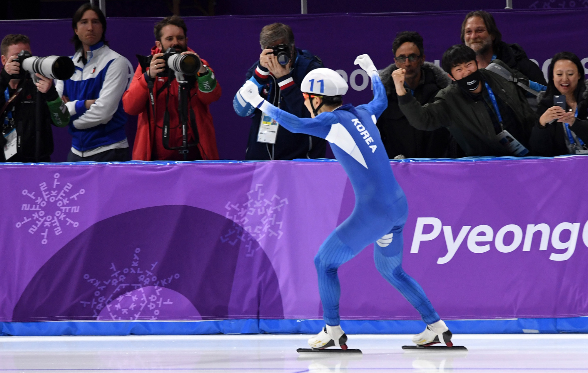 24일 오후 강원도 강릉 스피드스케이팅장에서 열린 2018 평창동계올림픽 스피드스케이팅 남자 매스스타트 결승에 출전한 한국 이승훈이 금메달을 확정짓고 환호하고 있다. 18.02.24. 2018평창사진공동취재단.