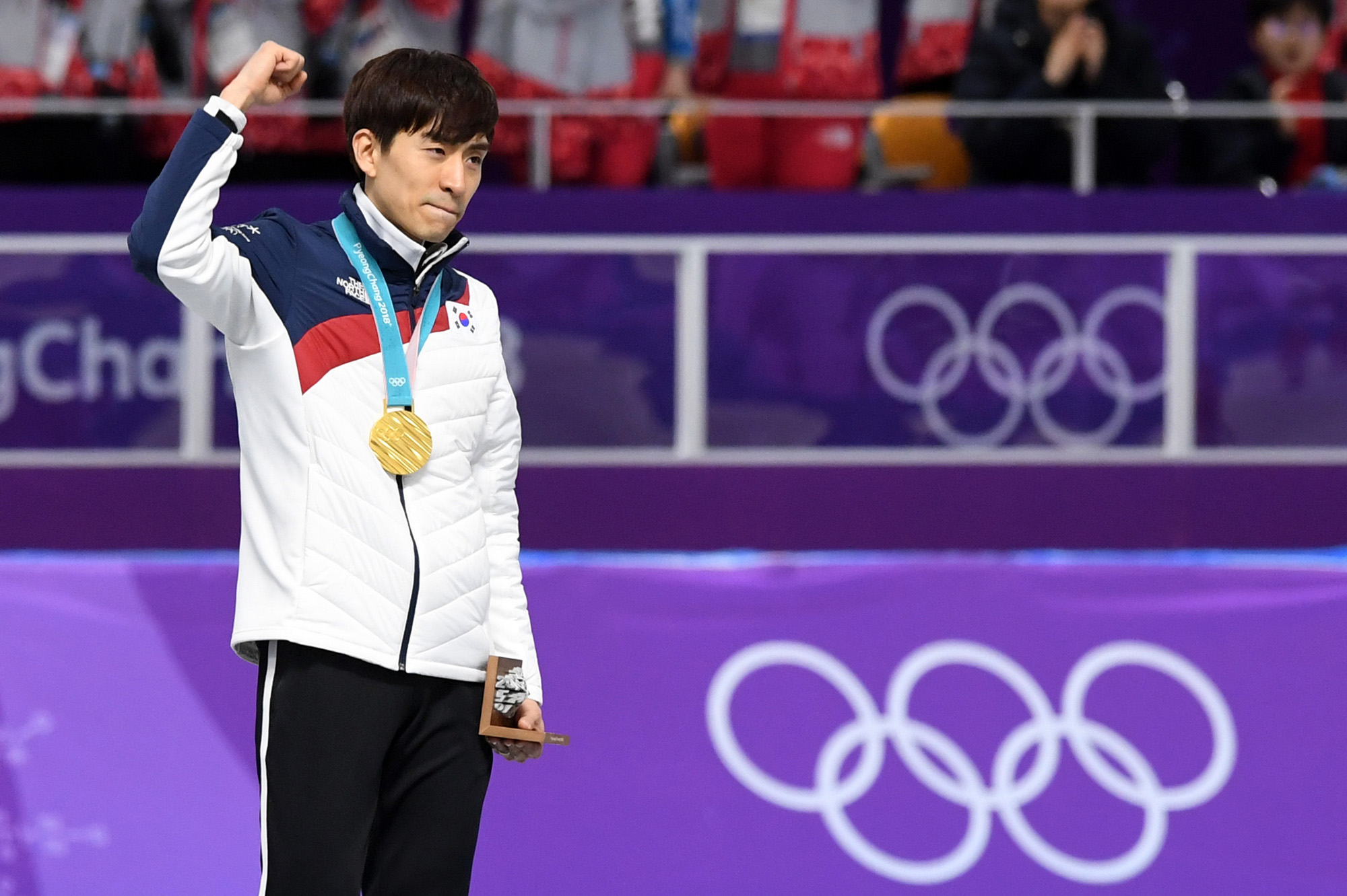 24일 오후 강원도 강릉 스피드스케이팅장에서 열린 2018 평창동계올림픽 스피드스케이팅 남자 매스스타트 결승에서 금메달을 획득한 이승훈이 금메달을 수여받고 주먹을 불끈 쥐고 있다. 18.02.24. 2018평창사진공동취재단.