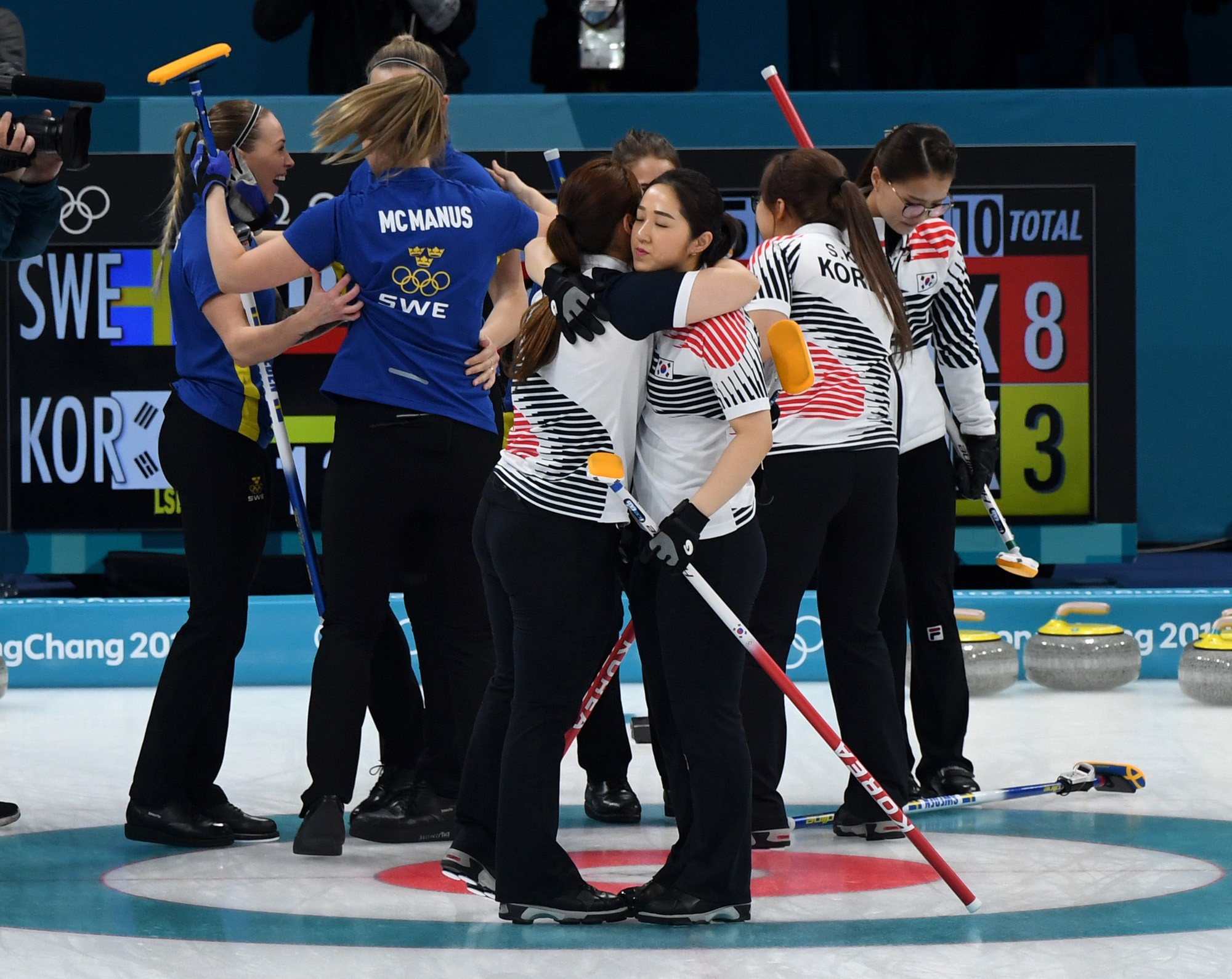 25일 오전 강원도 강릉 컬링센터에서 2018 평창동계올림픽 여자 컬링 한국과 스페인의 결승전이 열린 가운데 은메달을 딴 한국 선수들이 서로를 격려하고 있다. 18.02.25. 2018평창사진공동취재단.