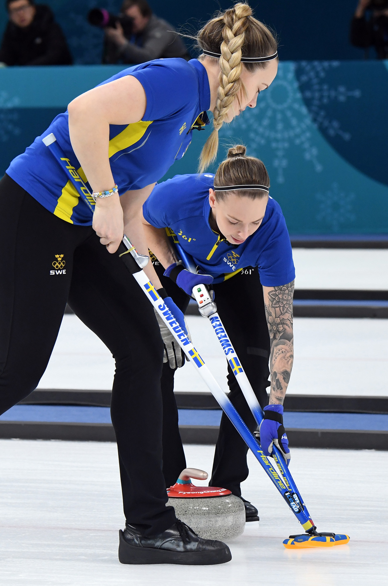25일 오전 강원도 강릉 컬링센터에서 열린 2018 평창동계올림픽 여자 컬링 결승전에서 스웨덴 선수들이 스위핑 하고 있다. 18.02.25. 2018평창사진공동취재단.
