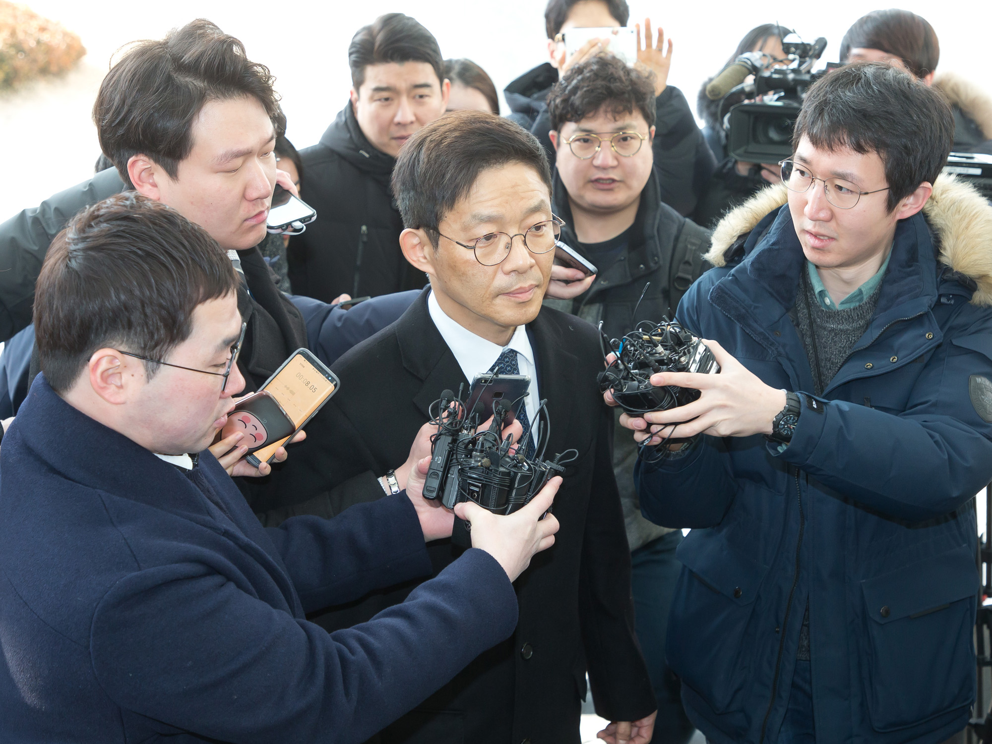 [서울=eoimage] (이오이미지) 임준선 기자 = '성추행 의혹'을 받고 있는 안태근(53, 사법연수원 20기) 전 검사장이 26일 오전 피의자 신분으로 조사를 받기 위해 서울 송파구 서울동부지검에 들어서고 있다. 2018.2.26