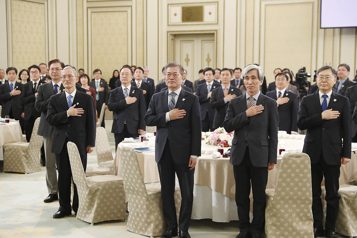 문재인 대통령이 22일 청와대 영빈관에서 열린 정책기획위원회 오찬 간담회에서 국민의례를 하고 있다.