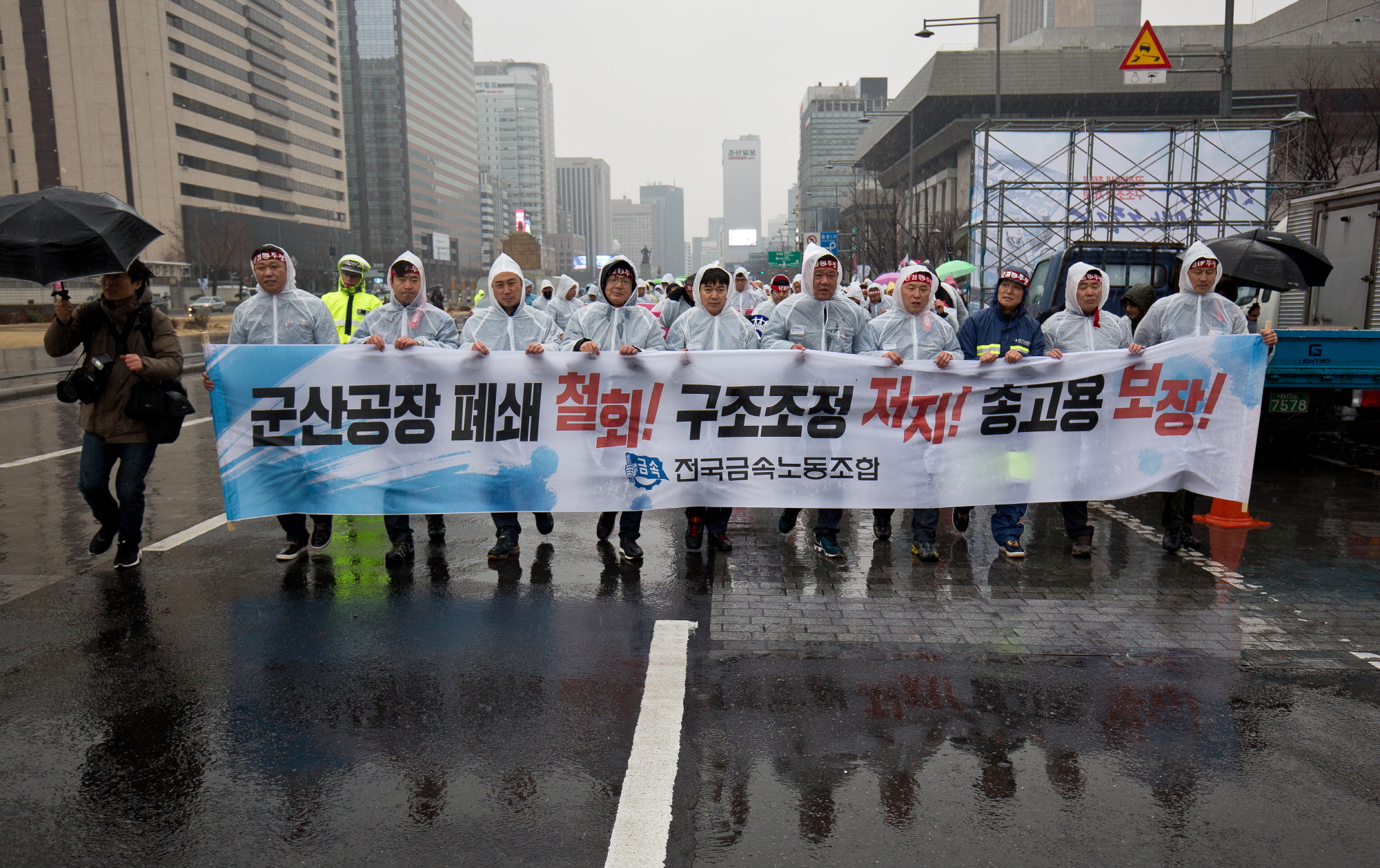 [서울=eoimage] 일요신문 고성준 기자 = 28일 오후 서울 종로구 정부서울청사 앞에서 금속노조 한국지엠지부 조합원들이 '한국지엠 총고용보장! 구조조정 저지! 30만 일자리지키기 금속노조 결의대회'를 열고 '군산공장 폐쇄 철회'와 '구조조정 중단'을 주장하고 있다. 2018.2.28