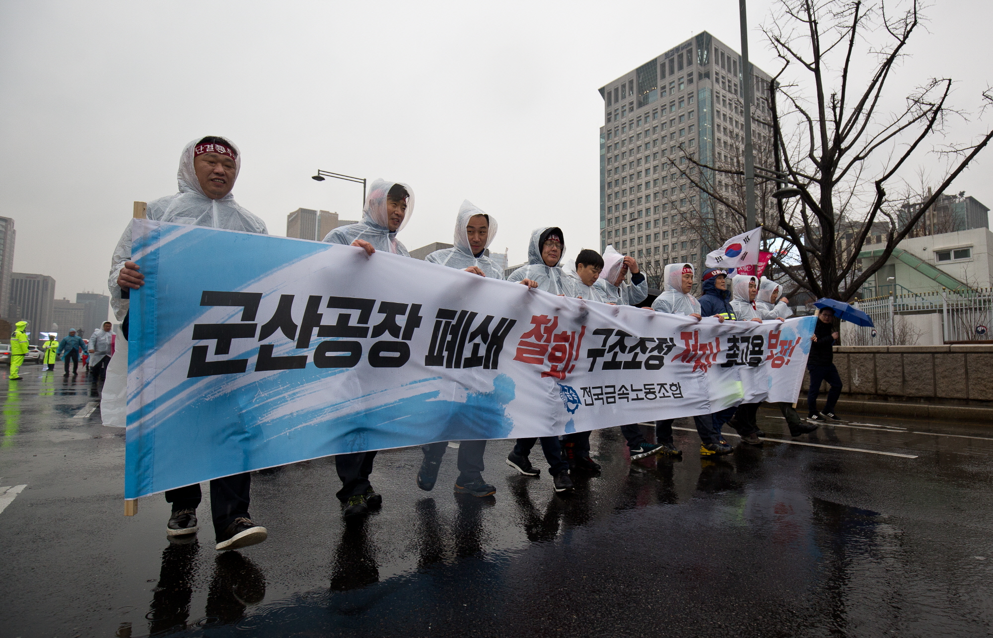 [서울=eoimage] 일요신문 고성준 기자 = 28일 오후 서울 종로구 정부서울청사 앞에서 금속노조 한국지엠지부 조합원들이 '한국지엠 총고용보장! 구조조정 저지! 30만 일자리지키기 금속노조 결의대회'를 열고 '군산공장 폐쇄 철회'와 '구조조정 중단'을 주장하고 있다. 2018.2.28