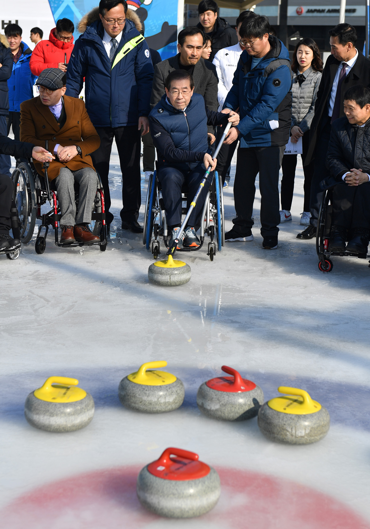 박원순 서울시장이 26일 오후 서울광장 스케이트장에서 열린 평창 동계패럴림픽대회 붐업 페스티벌에서 휠체어 컬링 체험을 하고 있다. 서울시 제공