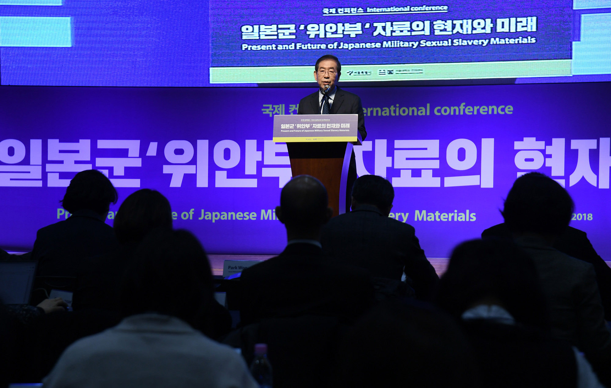 박원순 서울시장이 지난달 27일 오전 서울 중구 시청 다목적홀에서 열린 3.1절 99주년 '일본군 위안부 자료의 현재와 미래'포럼에서 환영사를 하고 있다. 서울시 제공