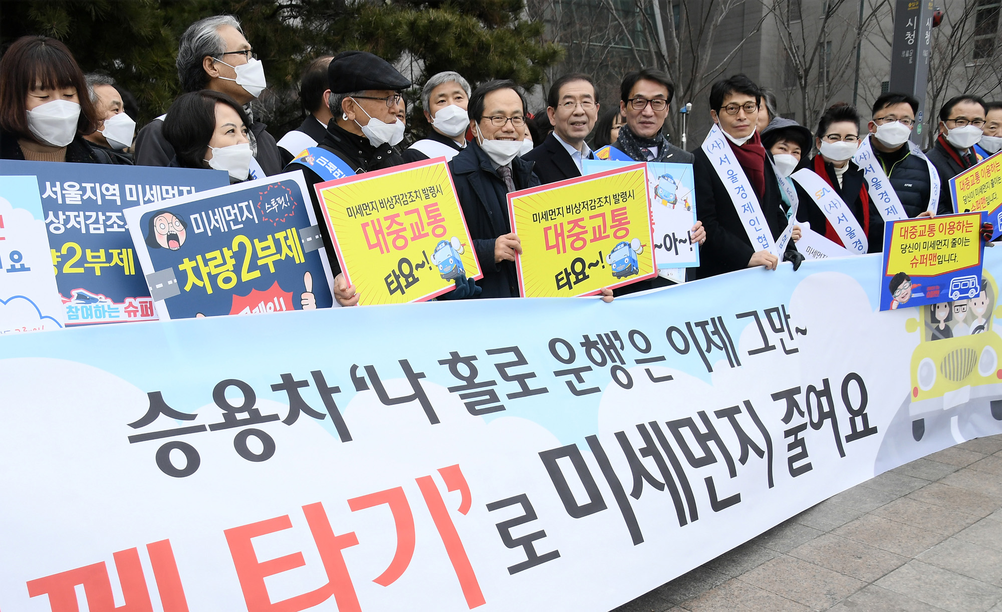 서울 기온이 영상 기온을 회복하며 미세먼지 농도가 '나쁨' 단계까지 오른 28일 서울 종로구 청계광장 인근에서 박원순 서울시장이 '미세먼지 줄이기 캠페인'을 펼치고 있다. 서울시 제공