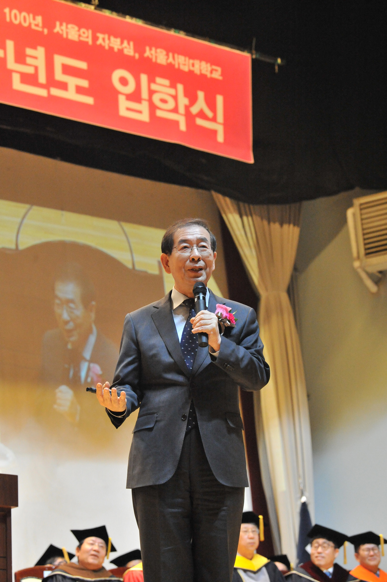28일 서울시립대 대강당에서 진행된 2018 서울시립대 입학식에서 박원순 서울시장이 축사를 하고 있다. 서울시 제공