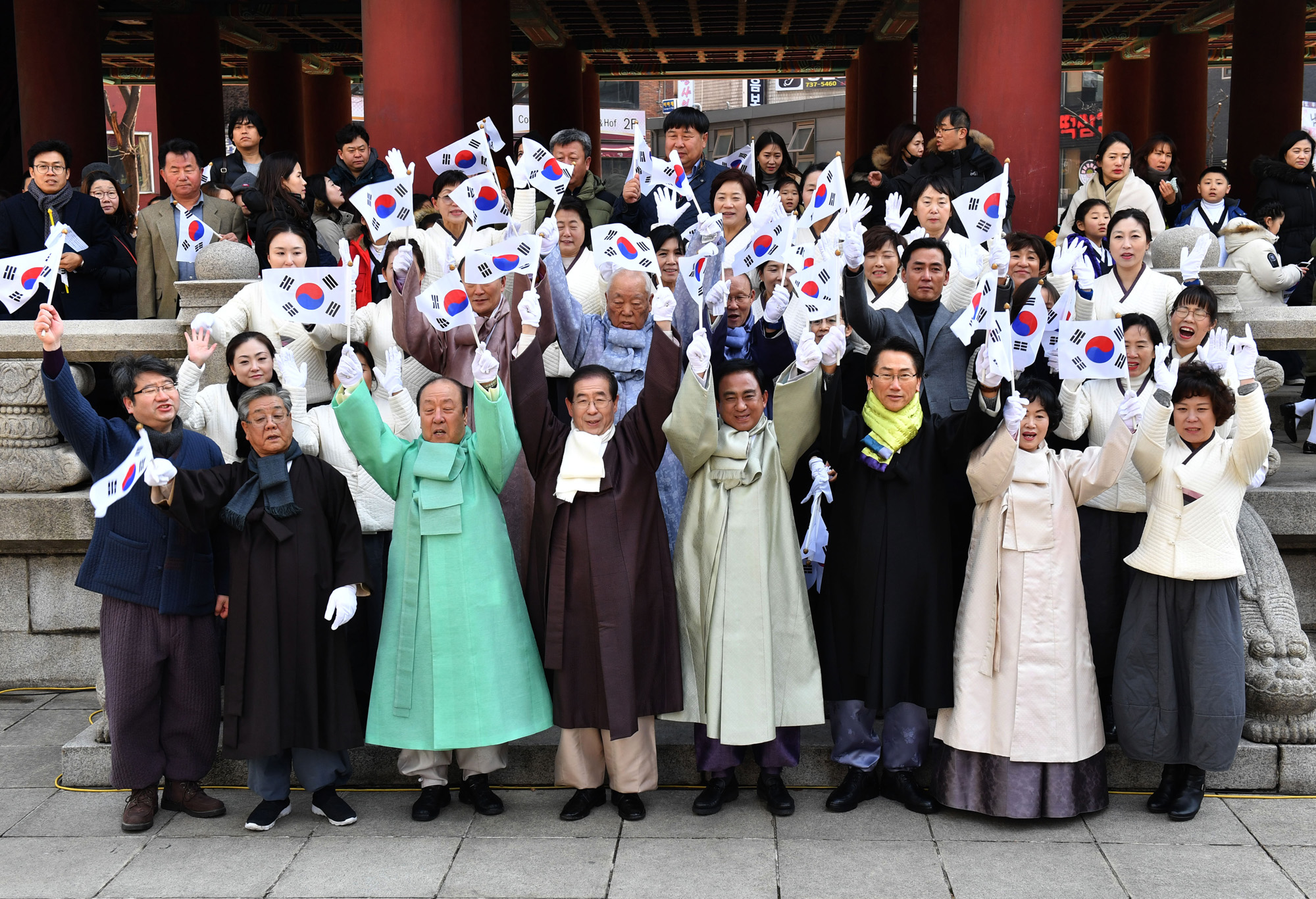 3.1절을 맞이하여 1일 오후 서울 종로구 보신각에서 박원순 서울시장과 양준욱 서울시의회 의장, 김영종 종로구청장을 비롯해 독립유공자 후손, 3·1운동 정신 계승활동, 국위선양 인물로 구성된 타종인사 12명이 4명씩 3개조로 나누어 각각 11번씩 모두 33번의 종을 치고 있다. 서울시 제공