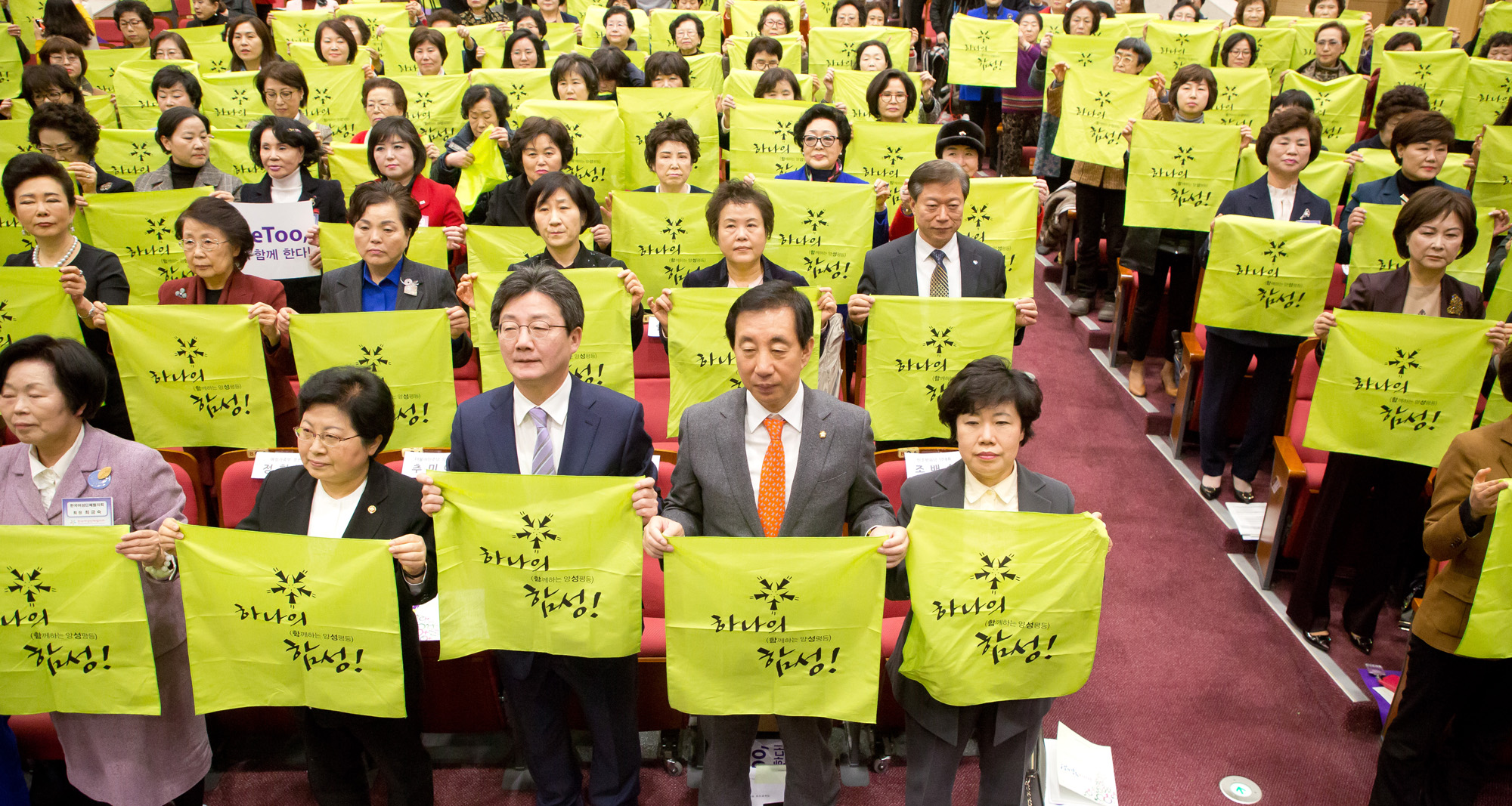 [서울=eoimage] (이오이미지) 임준선 기자 =정현백 여성가족부 장관과 유승민 바른미래당 공동대표, 김성태 자유한국당 원내대표, 조배숙 민주평화당 대표 등 참석자들이 8일 국회 의원회관에서 열린 3·8 세계여성의 날 기념행사 '하나의 함성'에서 미투 및 양성평등 지지 퍼포먼스를 하고 있다. 2018.03.08 |