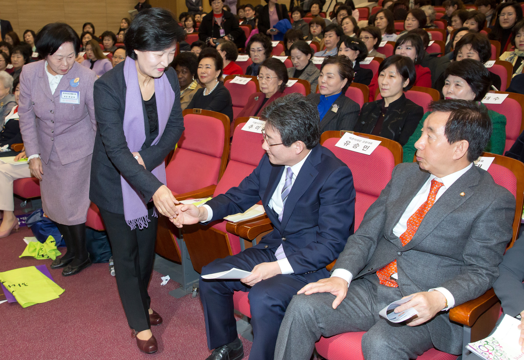 [서울=eoimage] (이오이미지) 임준선 기자 = 8일 오후 국회 의원회관에서 열린 3·8 세계여성의 날 기념행사에서 더불어민주당 추미애 대표와 유승민 대표가 악수하고 있다.
