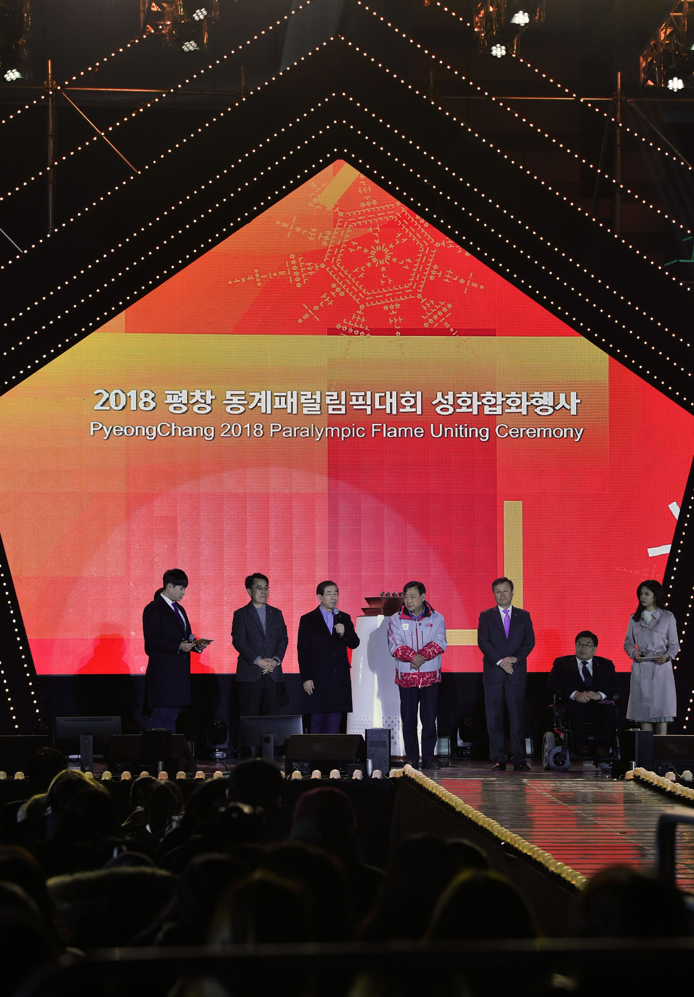 박원순 서울시장이 3일 오후 서울 송파구 올림픽공원 평화의 광장에서 열린 '2018 평창 동계 패럴림픽대회 성화합화행사'에서 인사말을 하고 있다. 서울시 제공
