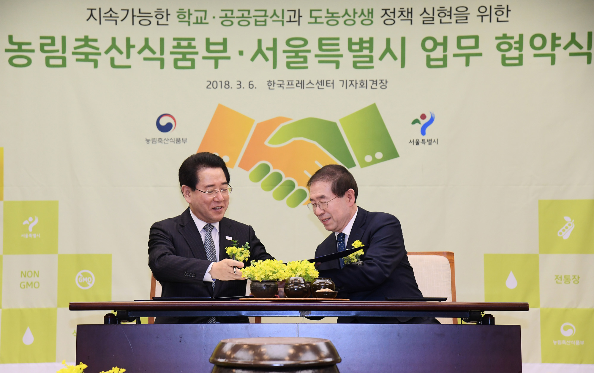 김영록(왼쪽) 농림축산식품부 장관과 박원순 서울시장이 6일 오후 서울 종로구 프레스센터에서 열린 지속가능한 공공급식과 도농상생 정책실현을 위한 농림축산식품부·서울특별시 업무협약식에서 협약서 서명 후 기념촬영하고 있다. 서울시 제공