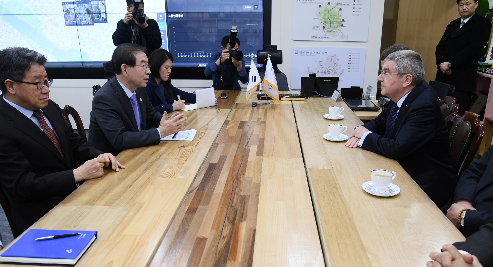 토마스 바흐 IOC위원장과 박원순 서울시장이 8일 오후 서울 중구 서울시청에서 열린 '서울특별시 명예시민증 수여식'에서 악수를 하고 있다. 이날 수여식에는 이기흥 대한체육회 회장, 김종훈 대한체육회 명예대사가 참석해 위촉을 축하했다. 서울시 제공