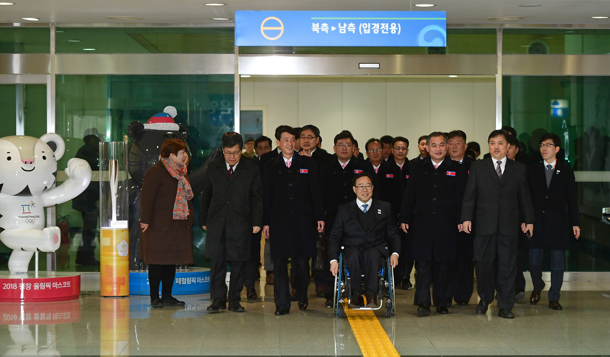 임찬규 평창동계패럼림픽 국장(가운데)을 비롯한 평창동계패럴림픽에 참가하는 북한 선수단과 대표단 24명이 7일 오전 경기 파주시 남북출입사무소(CIQ)를 통해 입경하고 있다. 통일부에 따르면 북한의 동계패럴림픽 참가는 이번이 처음이다. 2018.03.07