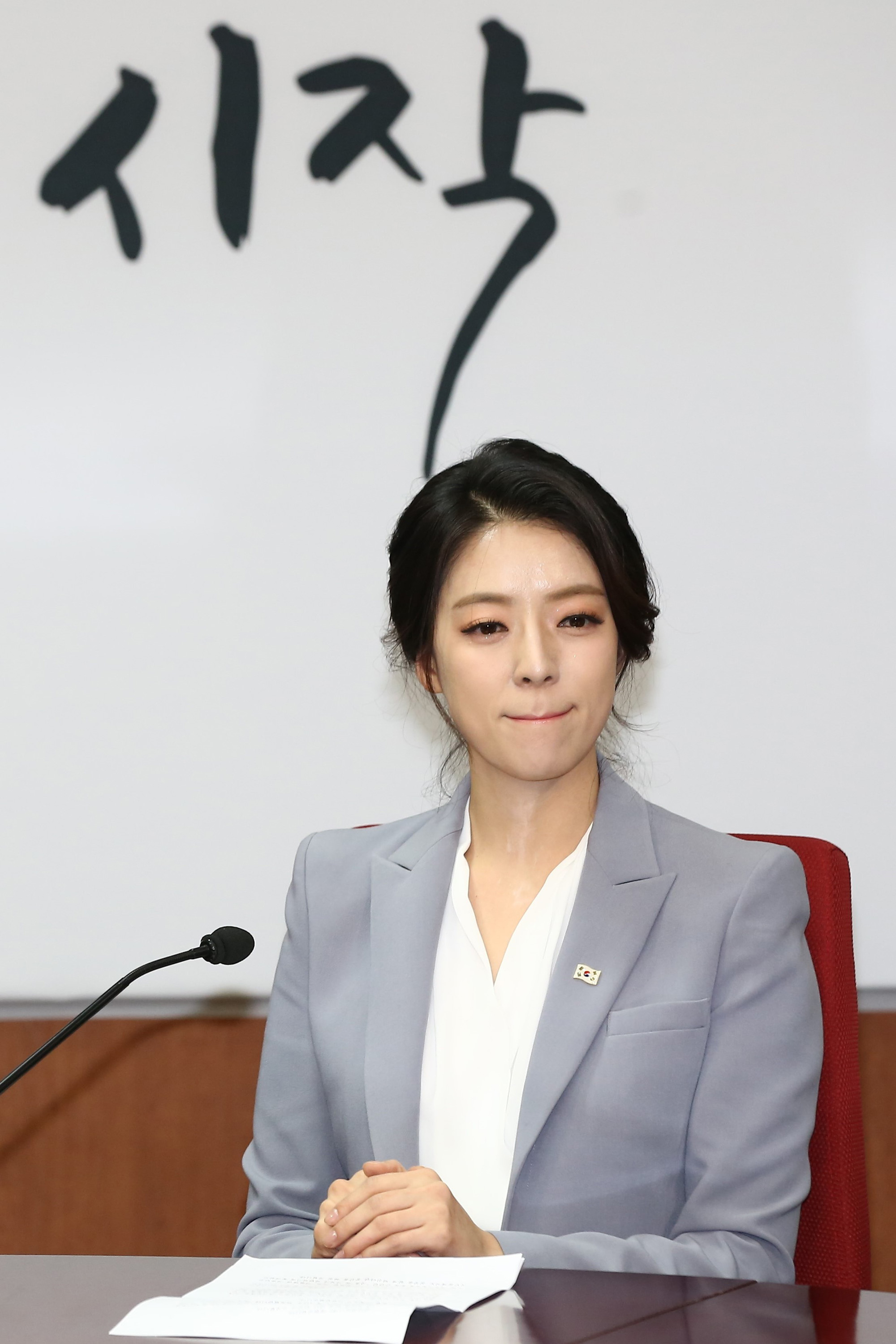 [eoimage=서울] 박은숙 기자 = 9일 서울 여의도 당사에서 열린 영입인사 환영식에서 입당한 배현진 MBC 전 아나운서가 참석해 있다. 2018. 3.9.eomaster@eoimage.com