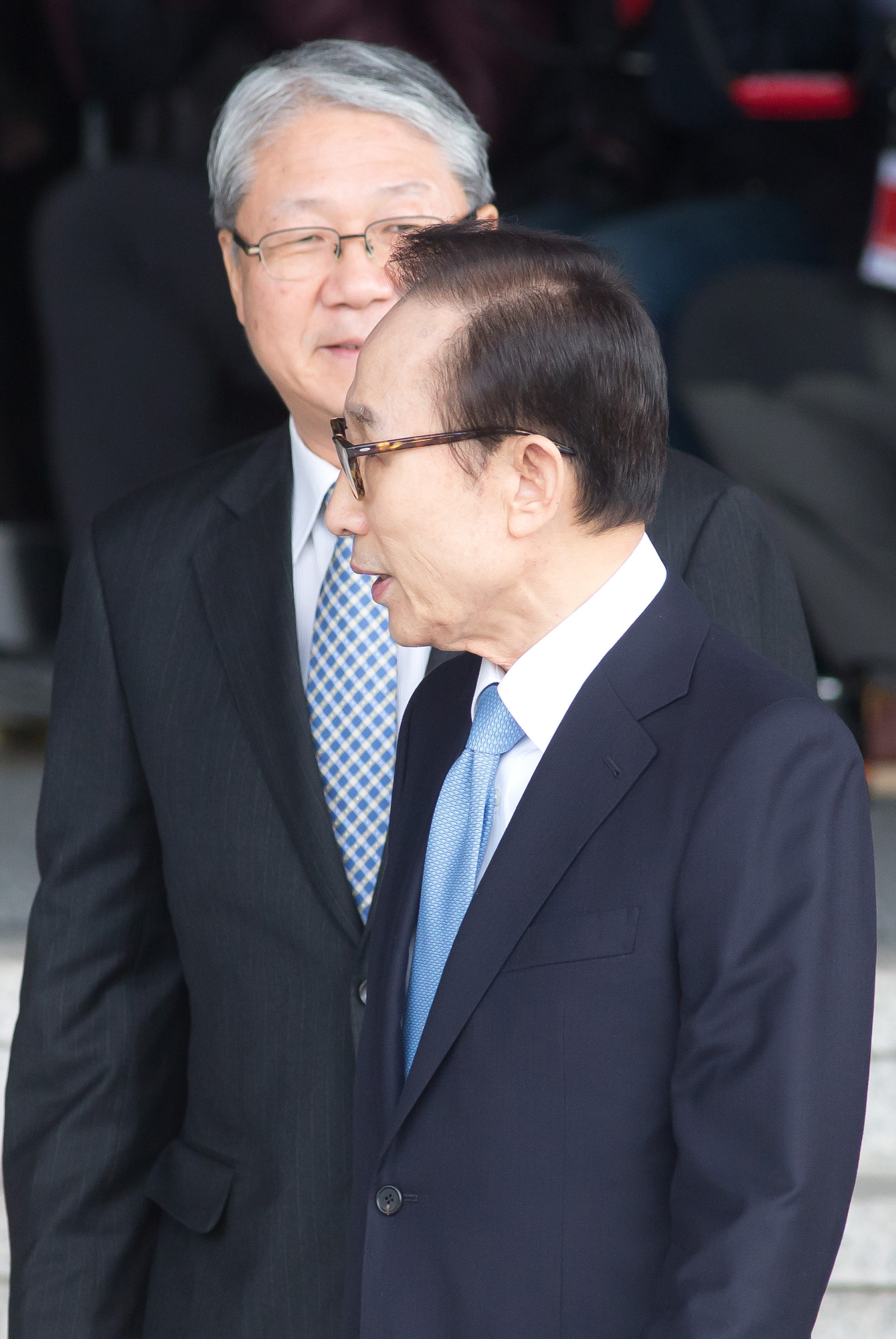 이명박 전 대통령이 14일 오전 서울 서초동 서울중앙지방법원에 피의자 신분으로 조사를 받기 위해 들어서있다.