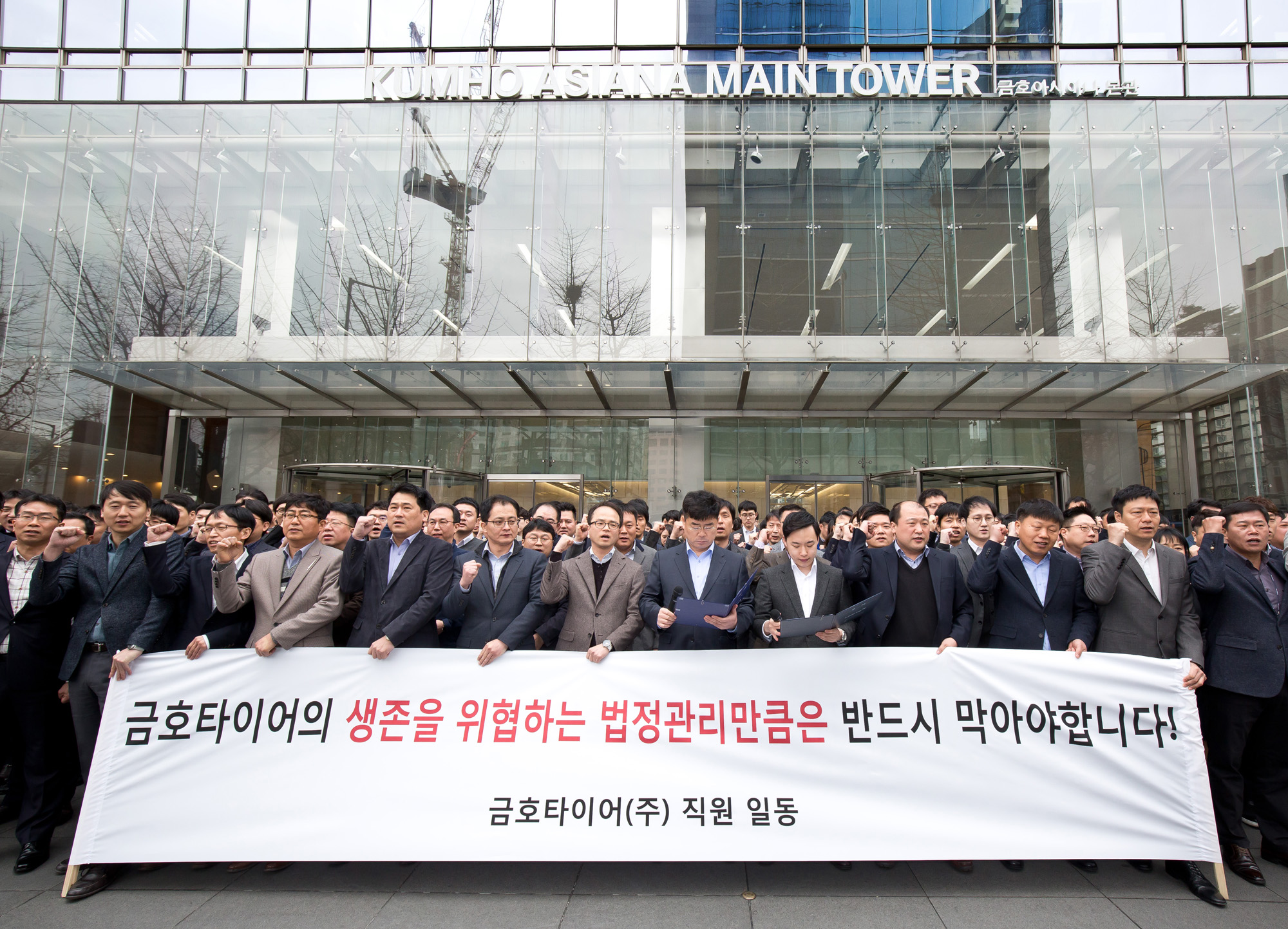 [서울=eoimage] (이오이미지) 임준선기자 = 금호타이어 사원모임 소속 직원들이 19일 서울 종로구 신문로 금호아시아나 본사 앞에서