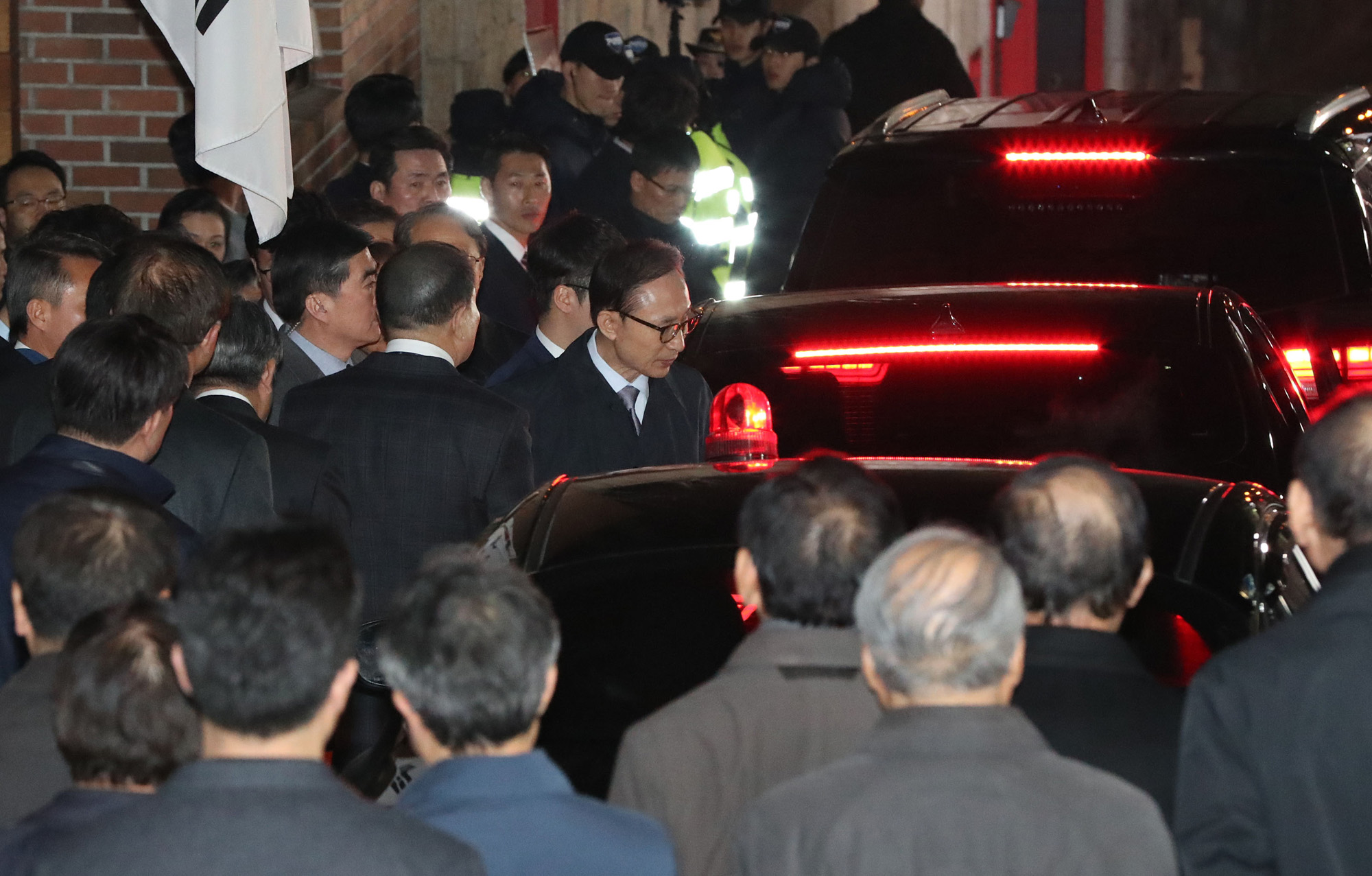 22일 이명박 전 대통령에 대한 구속영장이 발부된 가운데 이 전 대통령이 서울 강남구 논현동 자택을 나와 측근들과 인사를 하고 있다.