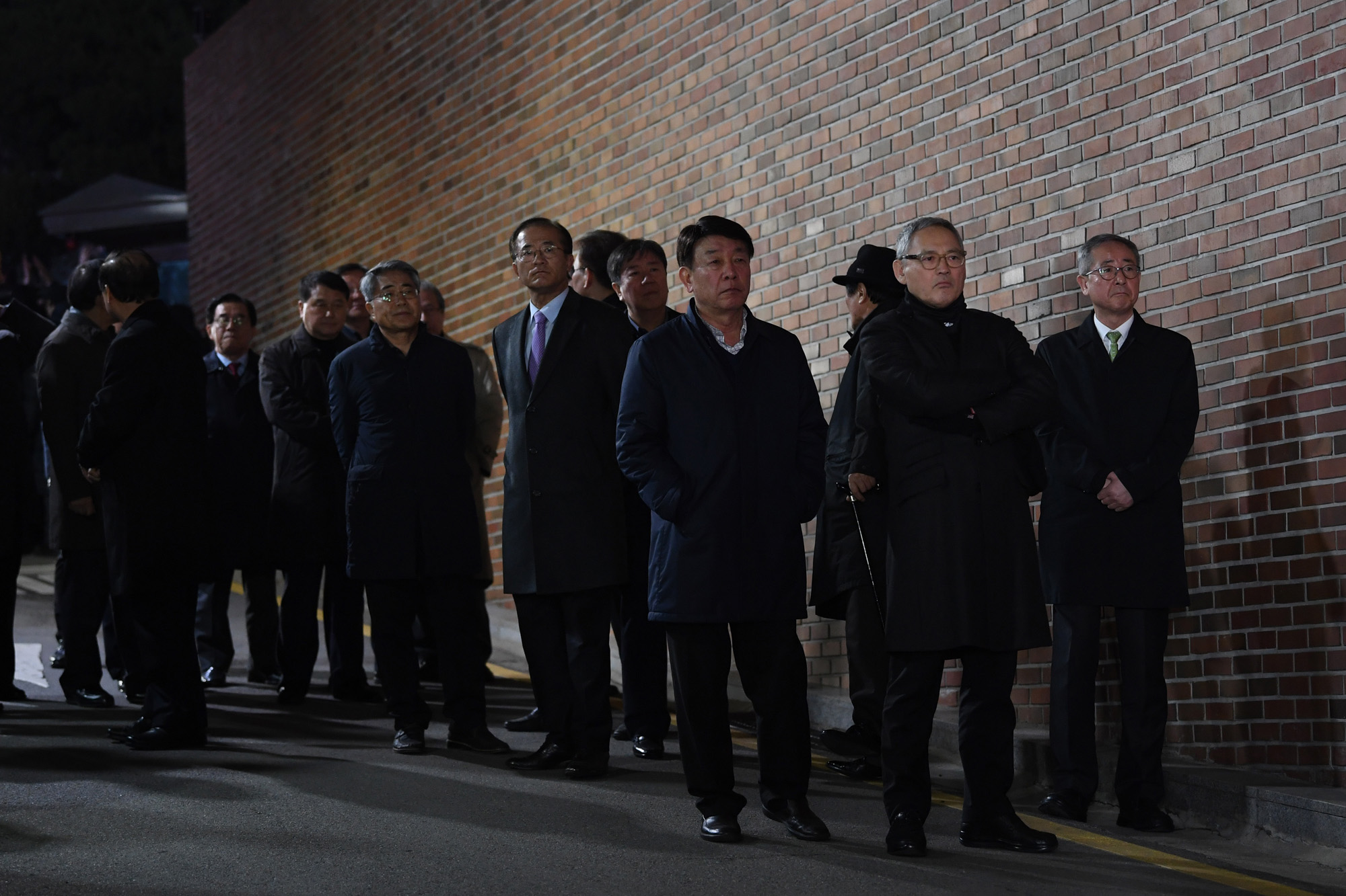 이명박 전 대통령에 대한 구속 영장이 발부된 22일 저녁 이 전 대통령이 서울 논현동 사저를 나서 검찰 차량에 탑승한 가운데 유인촌 전 장관을 비롯한 측근들이 이 전 대통령의 뒷모습을 바라보고 있다. 2018.03.23