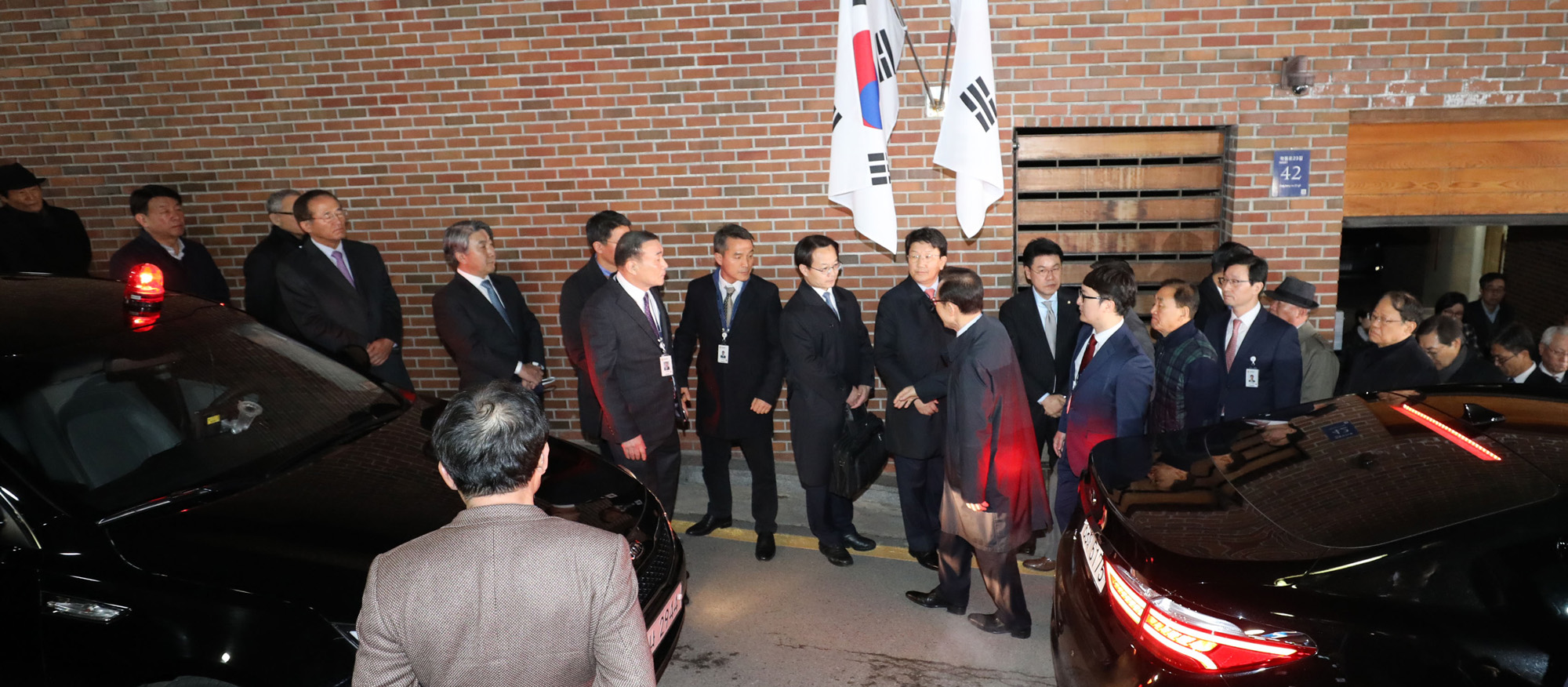 구속영장이 발부된 이명박 전 대통령이 23일 서울 논현동 자택을 나서서 구치소로 향하며 측근들과 인사하고 있다. 2018.03.23