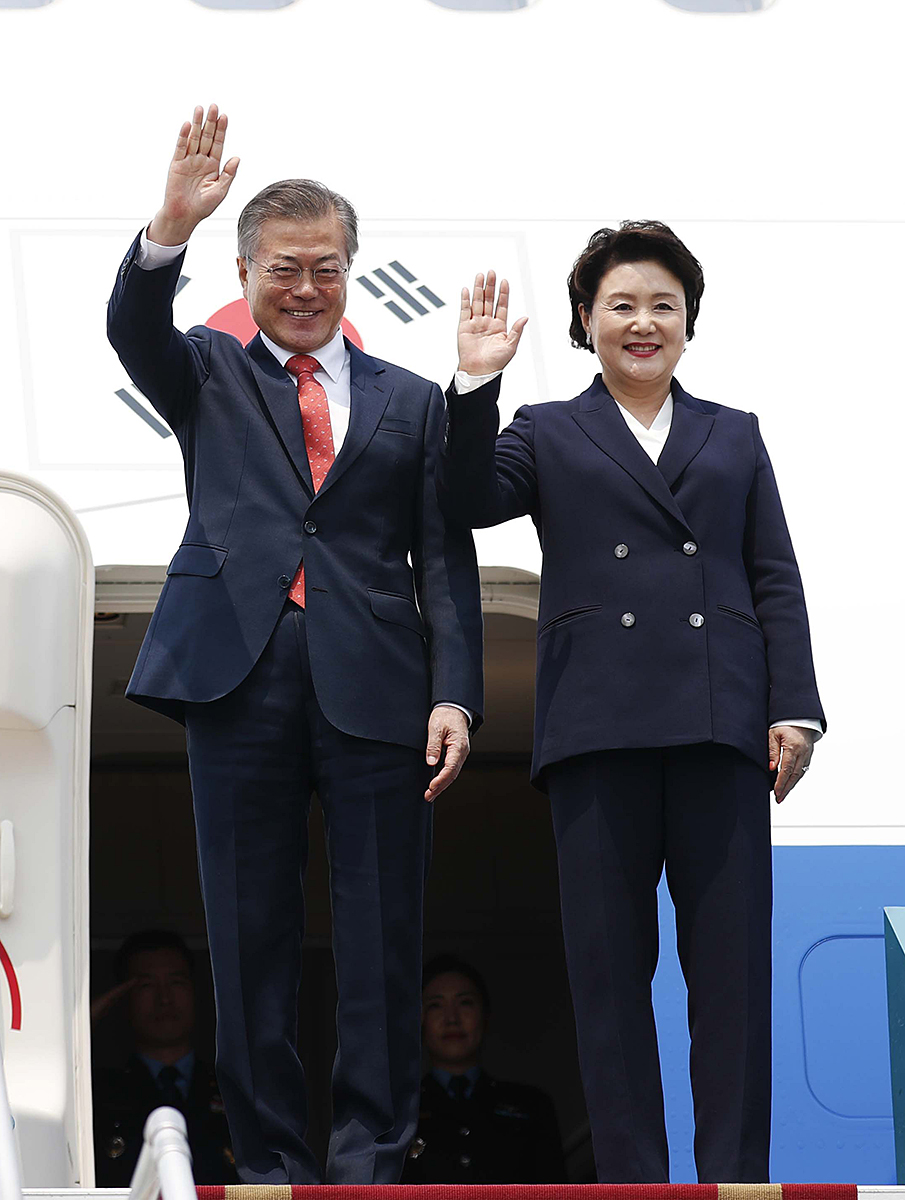 베트남을 국빈 방문한 문재인 대통령과 부인 김정숙 여사가 22일 오후 베트남 하노이 노이바이 국제공항에 도착한 뒤 베트남 의장대의 사열을 받고 있다.