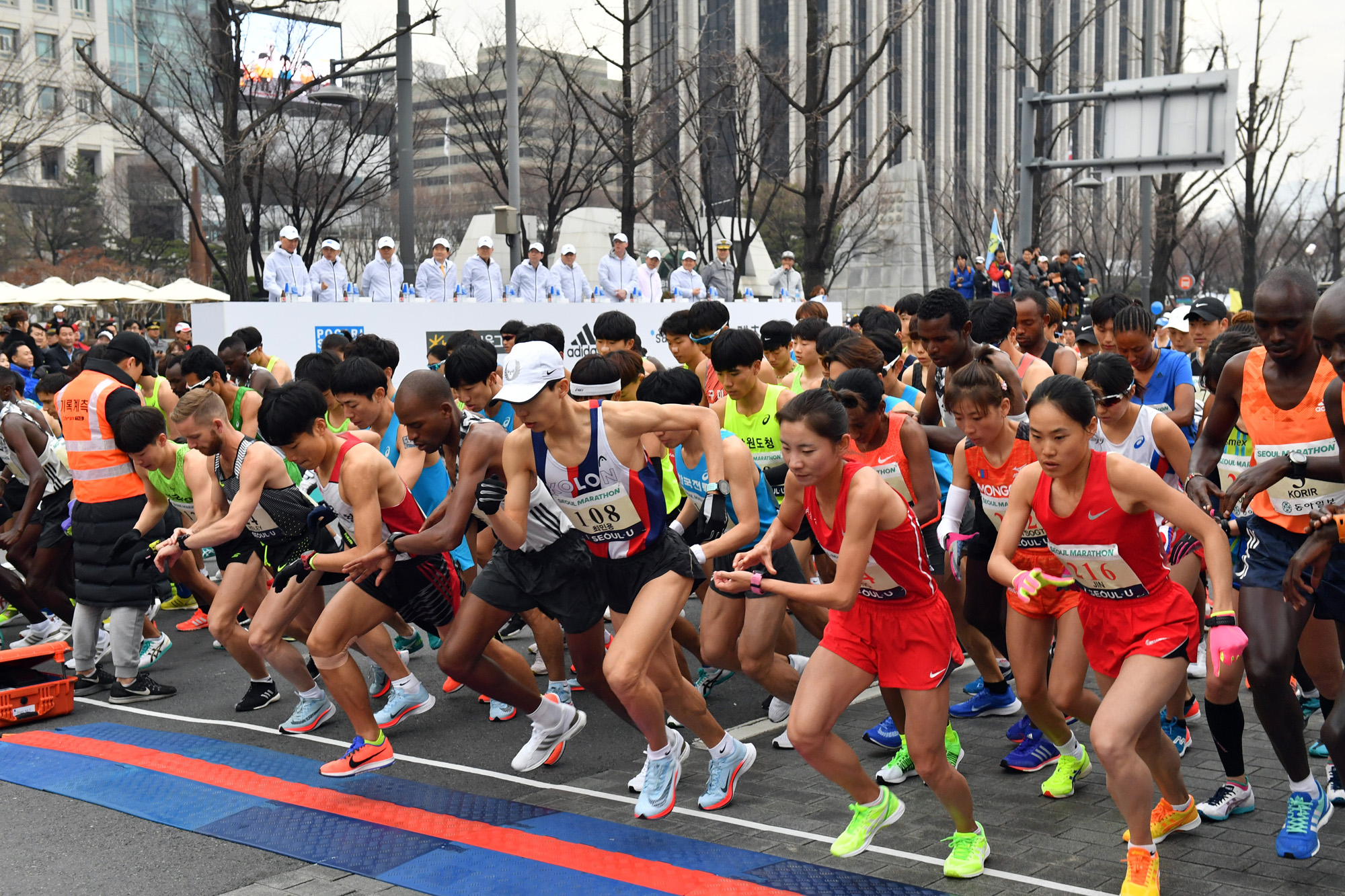 2018 서울국제마라톤겸 제89회 동아마라톤이 18일 오전 서울 광화문광장에서 화려한 스타트를 끊었다. 박원순 서울시장이 일반 참가자들과 함께 손은 잡으며 인사를 하고 있다. 서울시 제공
