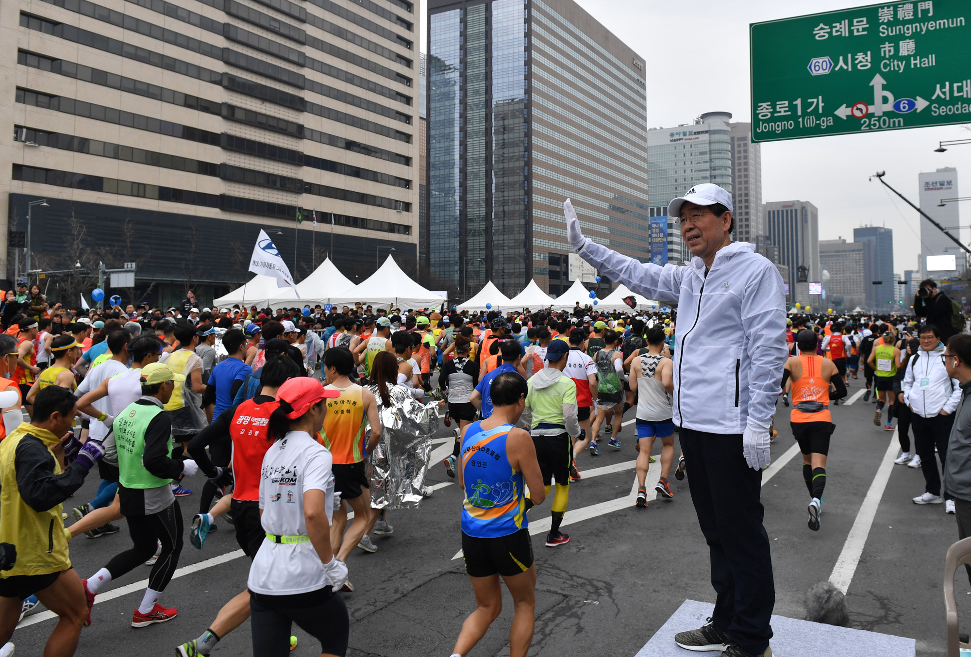 2018 서울국제마라톤겸 제89회 동아마라톤이 18일 오전 서울 광화문광장에서 화려한 스타트를 끊었다. 박원순 서울시장이 일반 참가자들과 함께 손은 잡으며 인사를 하고 있다. 서울시 제공