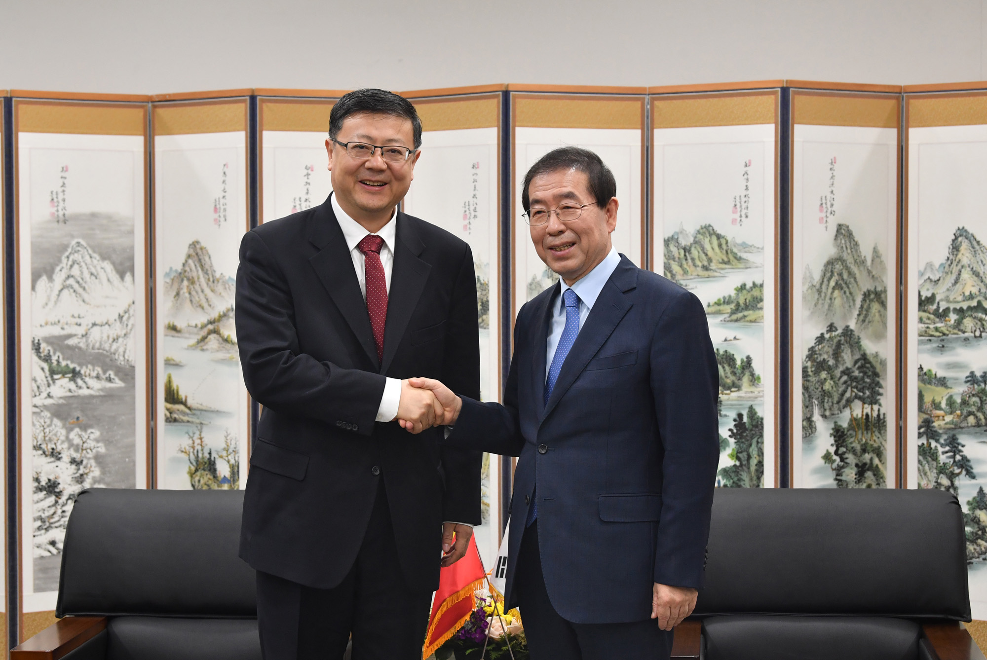 박원순 서울시장과 천지닝 중국 베이징시장이 19일 서울 중구 서울시청 대회의실에서 '서울-베이징 통합위원회 제3차 전체회의'에 참석하고 있다. 서울시 제공