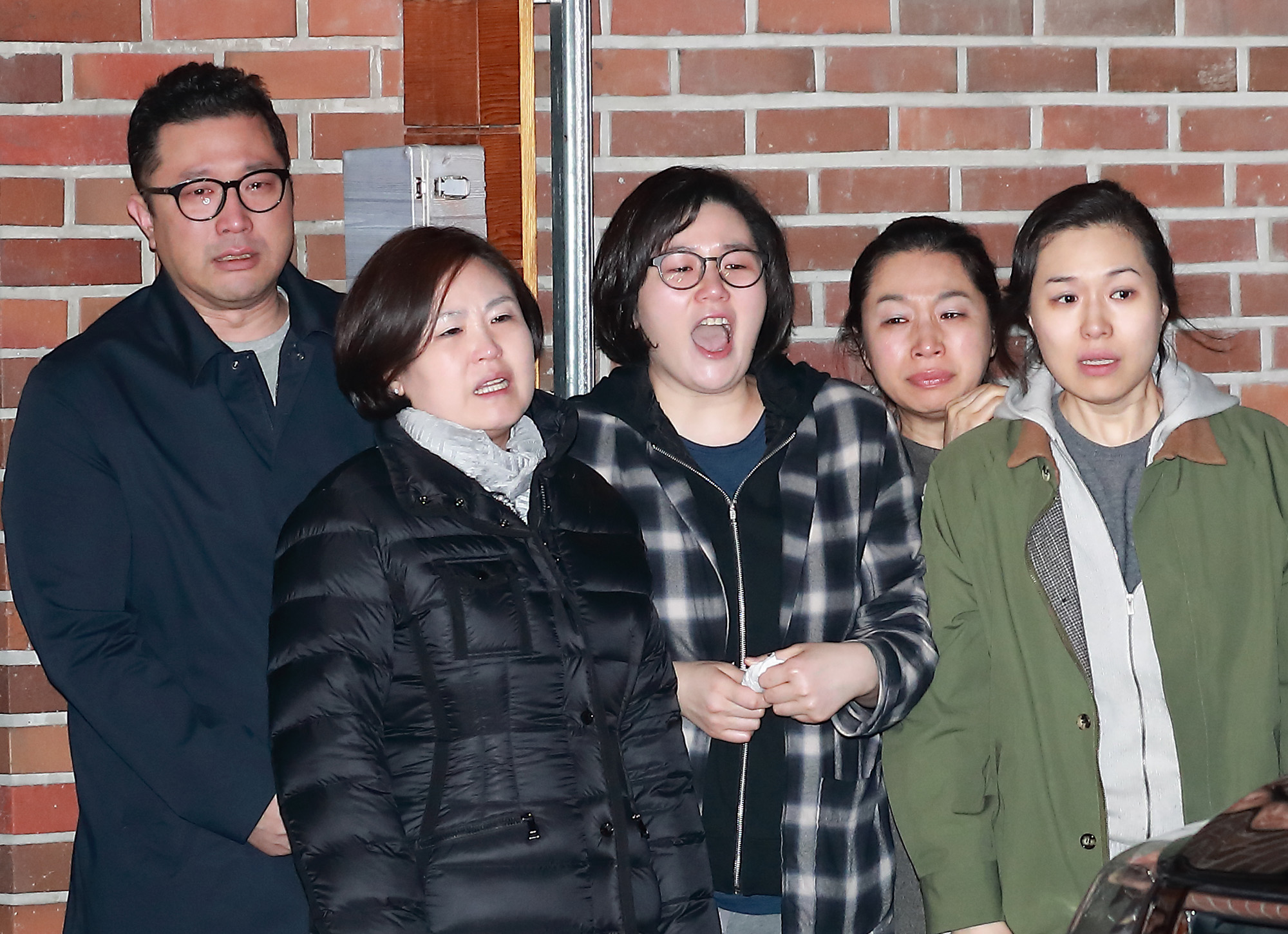 이명박 전 대통령에 대한 구속영장이 23일 서울 강남구 논현동 자택에서 집행되어 동부구치소로 이송된 가운데, 아들 이시형씨(왼쪽)를 비롯한 딸과 가족들이 주차장 입구까지 나와 눈물을 흘리며 배웅하고 있다. 2018.3.23 사진 임준선기자 (현장풀)
