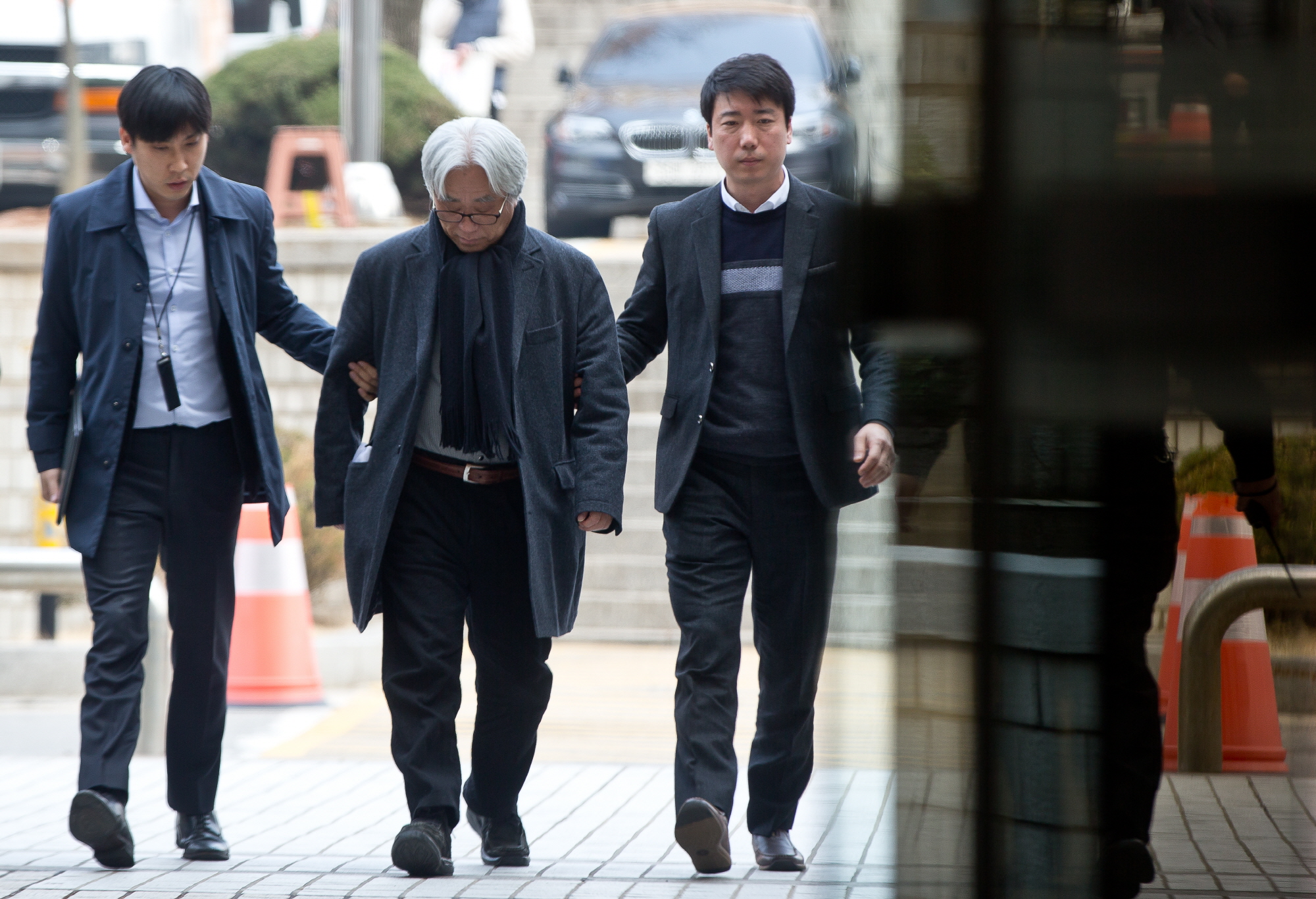 [서울=eoimage] 고성준 기자 = 이윤택 연출가가 23일 오전 서울 서초구 서울중앙지방법원에서 열린 영장실질심사에 출석하고 있다. 2018.3.23