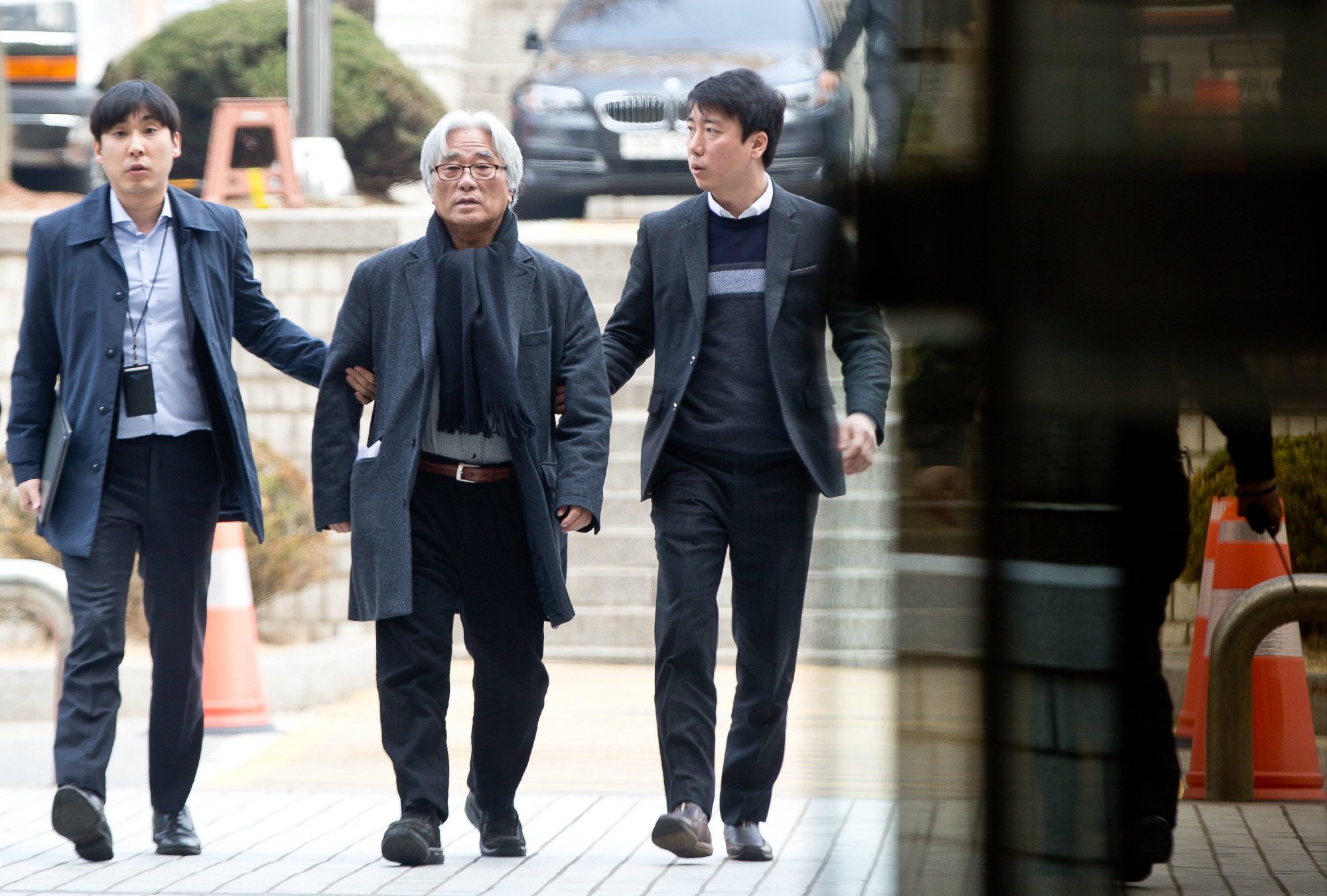 [서울=eoimage] 고성준 기자 = 이윤택 연출가가 23일 오전 서울 서초구 서울중앙지방법원에서 열린 영장실질심사에 출석하고 있다. 2018.3.23