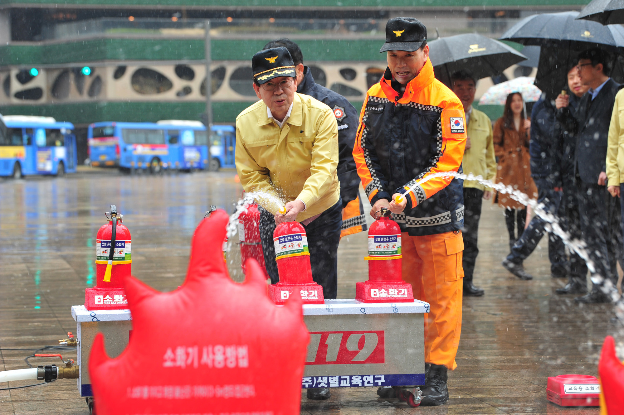 박원순 서울시장이 21일 서울 중구 서울시청에서 앞 광장에서 '제406차 민방위의 날 화재대비 대피훈련'을 하고 있다. 서울시 제공