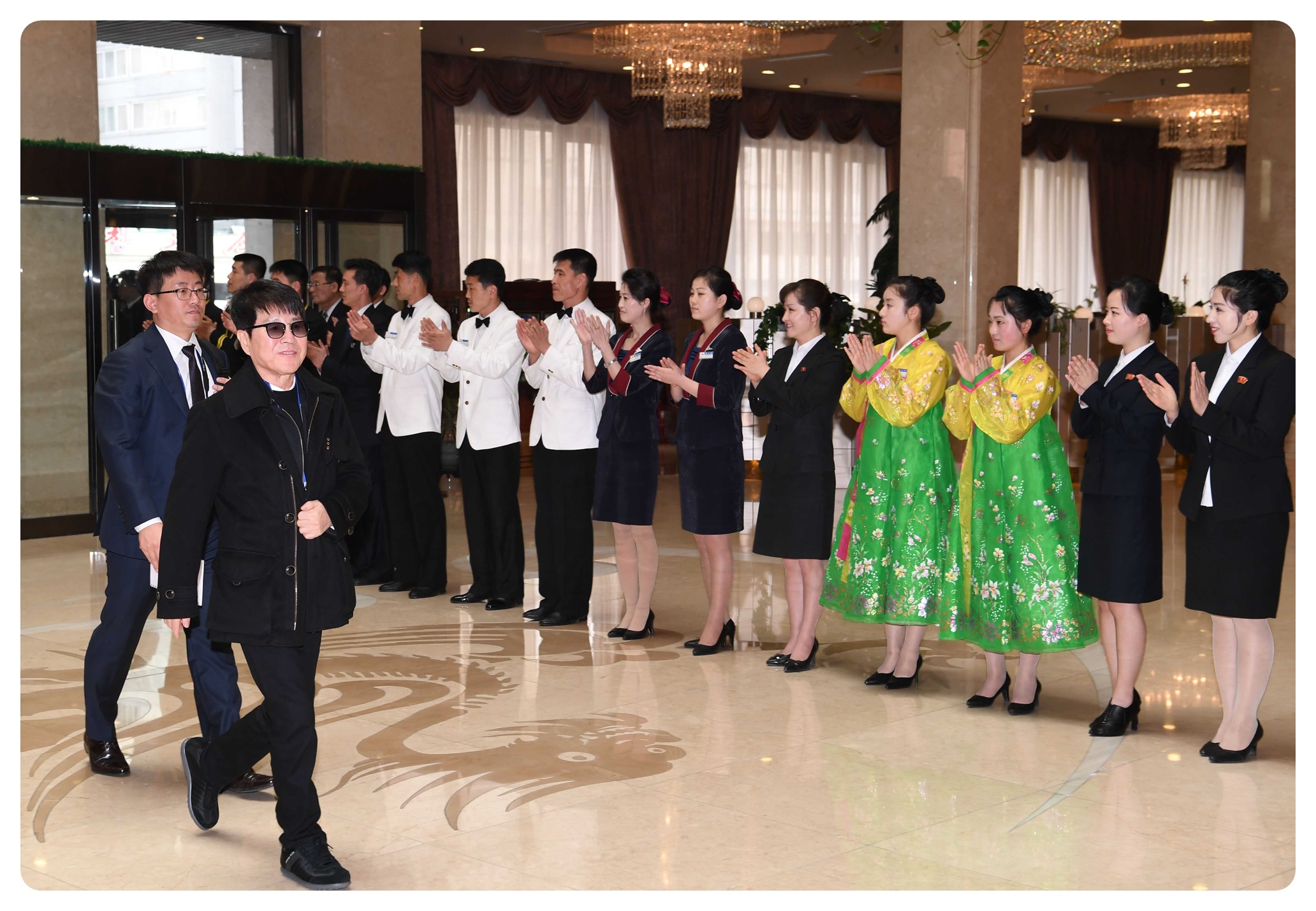 31일 오전 남북평화협력기원 남측예술단 평양공연팀이 평양 순안 공항에 도착. 가수 조용필씨가 숙소인 평양 고려호텔 직원들의 환영을 받으며 들어서고 있다2018.3.31 평양공연 사진 공동취재단