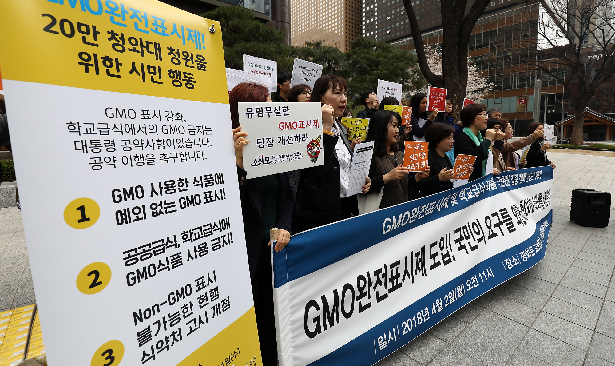 [서울=eoimage] 고성준 기자 = 2일 오전 서울 종로구 교보문고 광화문점 앞에서 GMO완전표시제 시민청원단 소속 시민들이 'GMO완전표시제 및 학교급식 퇴출 국민청원 집중캠페인 선포' 기자회견을 하고있다. 2018.4.2