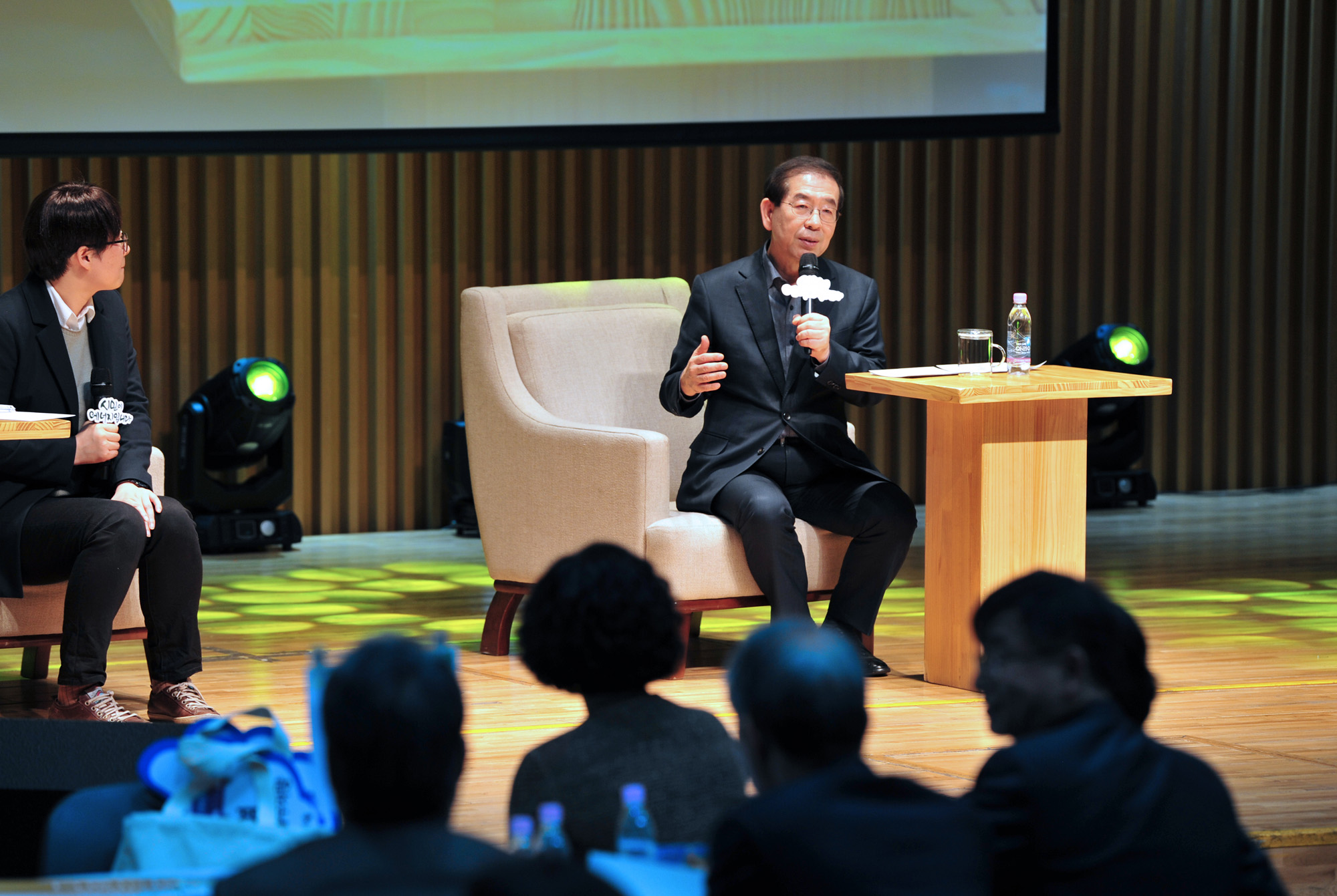 박원순 서울시장이 31일 오후 서울 중구 서울시청 다목적홀에서 열린 '서울 에너지 전환의 리더 에너지자립마을 타운홀 미팅'에 참석해 인사말을 하고 있다. 서울시 제공